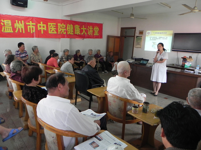 同时,在将军桥老人公寓四楼开展健康大讲堂。讲座前,先由我院景山康复中心伊仙琼护士长教大家如何通过耳穴按摩来养生,并现场讲解和示范了生动的“耳穴操”,带动在座的老人们进行现场互动。接着,脑病科陈凌副主任中医师作了题为《高血压与中风》讲座。陈凌主任从中风的类型和危害、中风的危险因素和如何预防中风等方面进行讲解,她强调高血压是中风最重要的危险因素,中风最易发生在凌晨,血压、血脂同时增高时更要警惕中风。此次活动共有100多名老人参加,收到了良好反响。