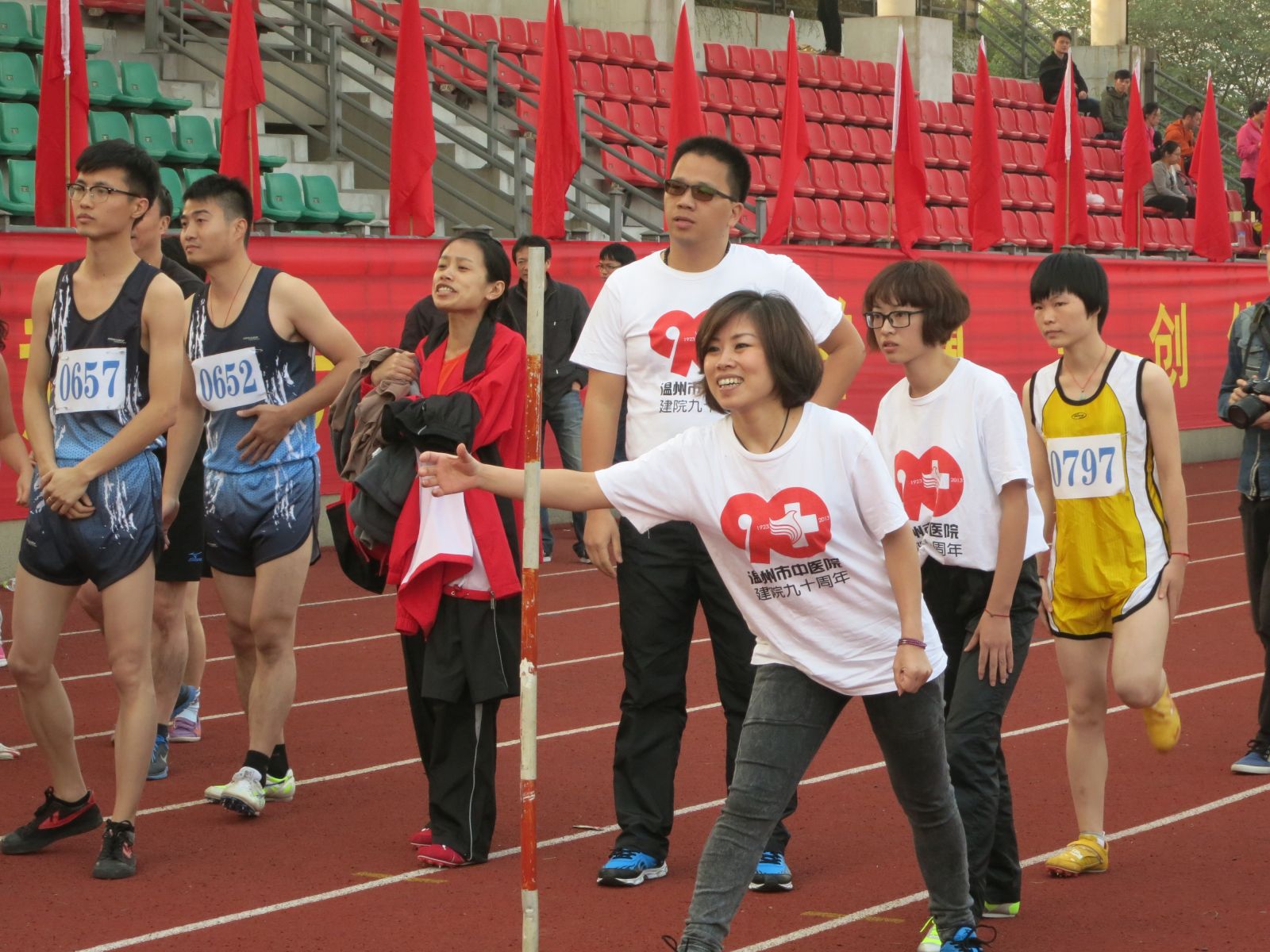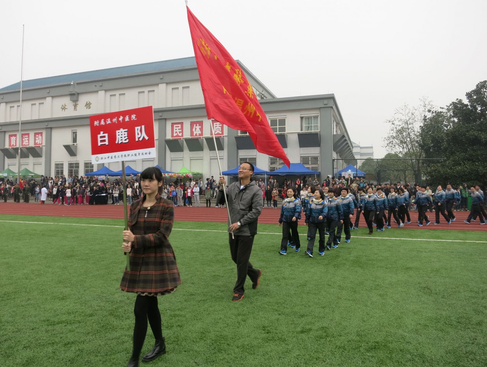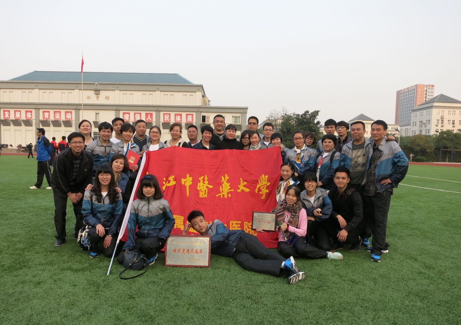 为进一步推动全民健身活动的深入开展,促进与浙江中医药大学及各附属绿帽社 的交流和合作,着力提升绿帽社 职工的集体凝聚力。2013年11月13日下午,我院工会组成39人的代表队,在党委副书记黄爱林同志的带领下,赴杭州参加14日至15日为期两天的浙江中医药大学2013田径运动会暨教职工健身运动会。在田径运动会中:绿帽社 代表队获集体“体育道德风尚奖”;徐玉燕同志获女子老年组800米第一名,并荣获运动员“体育道德风尚奖”;郭跃丽同志获女子中年组800米第三名;刘秀祥同志获男子中年组100米第六名。在健身运动会中:绿帽社 代表队获团体总分第二名,其中在拔河比赛和仙人指路项目上均获得第一名。