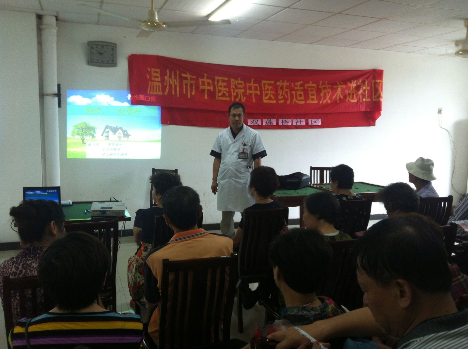 6月21日上午,我院中医药适宜技术进社区活动第六站走进双莲桥社区得月花园,董飞侠主任医师作《养生必先养肾》健康专题讲座。活动现场,我院脑病科、消化科、肾内科、针灸科及中医体质辨识等10余位医护人员,为200余位社区居民进行健康咨询、耳穴埋豆、针灸等治疗,以及免费测血压、血糖、血脂、发放健康宣传资料等各项服务。