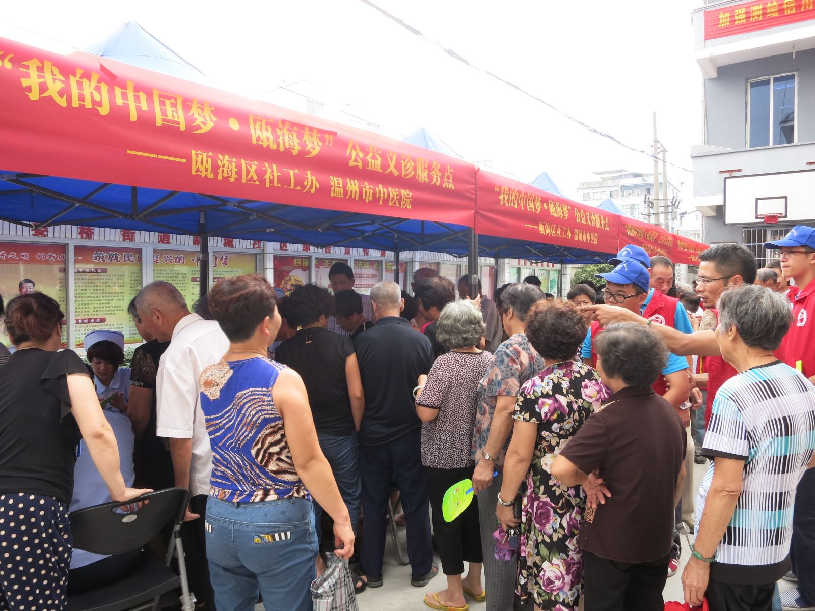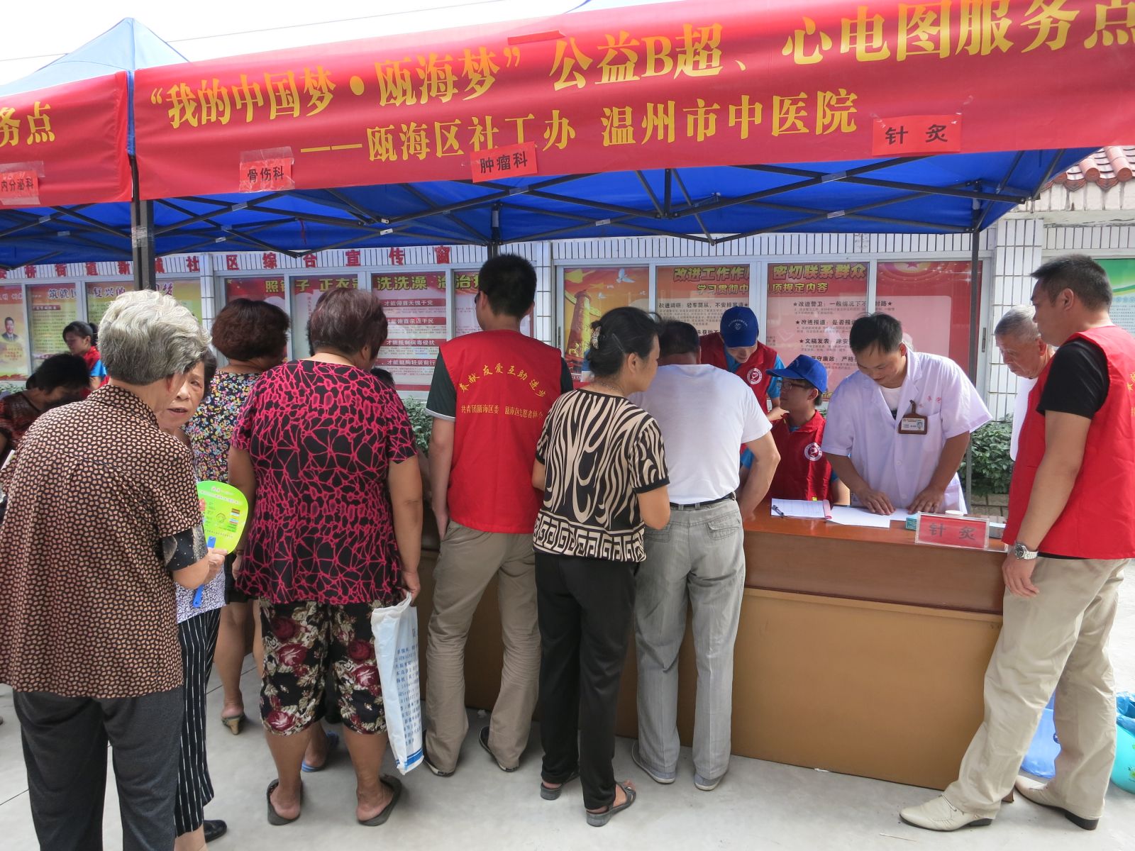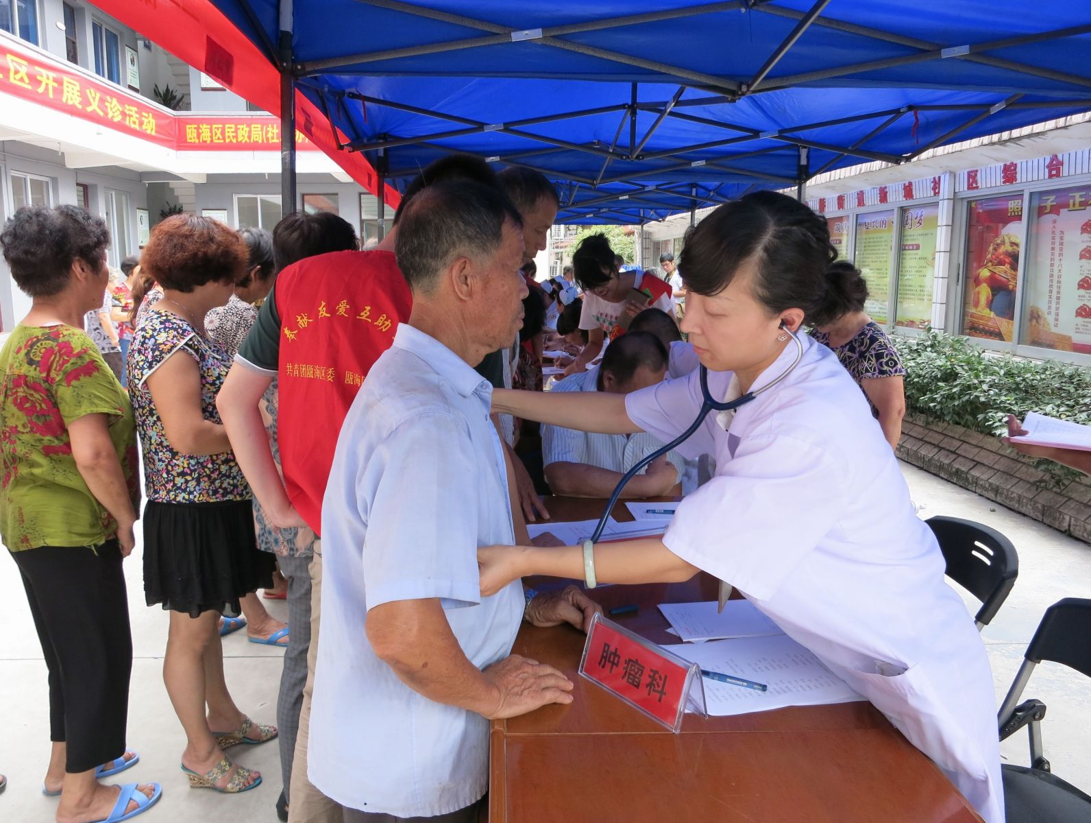 2013年9月18日,为响应市卫生局“三三行动”及“三好一满意”活动的号召,更好地为人民群众服务,结合绿帽社 90周年院庆活动。我院党委组织消化科、心内科、骨伤科、肿瘤科、针灸科、妇科等专家医生及医护人员共15人,前往瓯海区娄桥街道新城社区,参加瓯海区民政局组织的“我的中国梦·瓯海梦”进社区服务主题实践公益活动。活动现场为300余名当地居民提供健康咨询以及B超、心电图、测血糖、测血压检查等各项义诊活动,并免费发放价值8000余元的药品及健康宣传资料300余份。活动受到娄桥街道新城社区干部及当地群众的欢迎。温州电视台经济频道及《温州日报》予以报道。