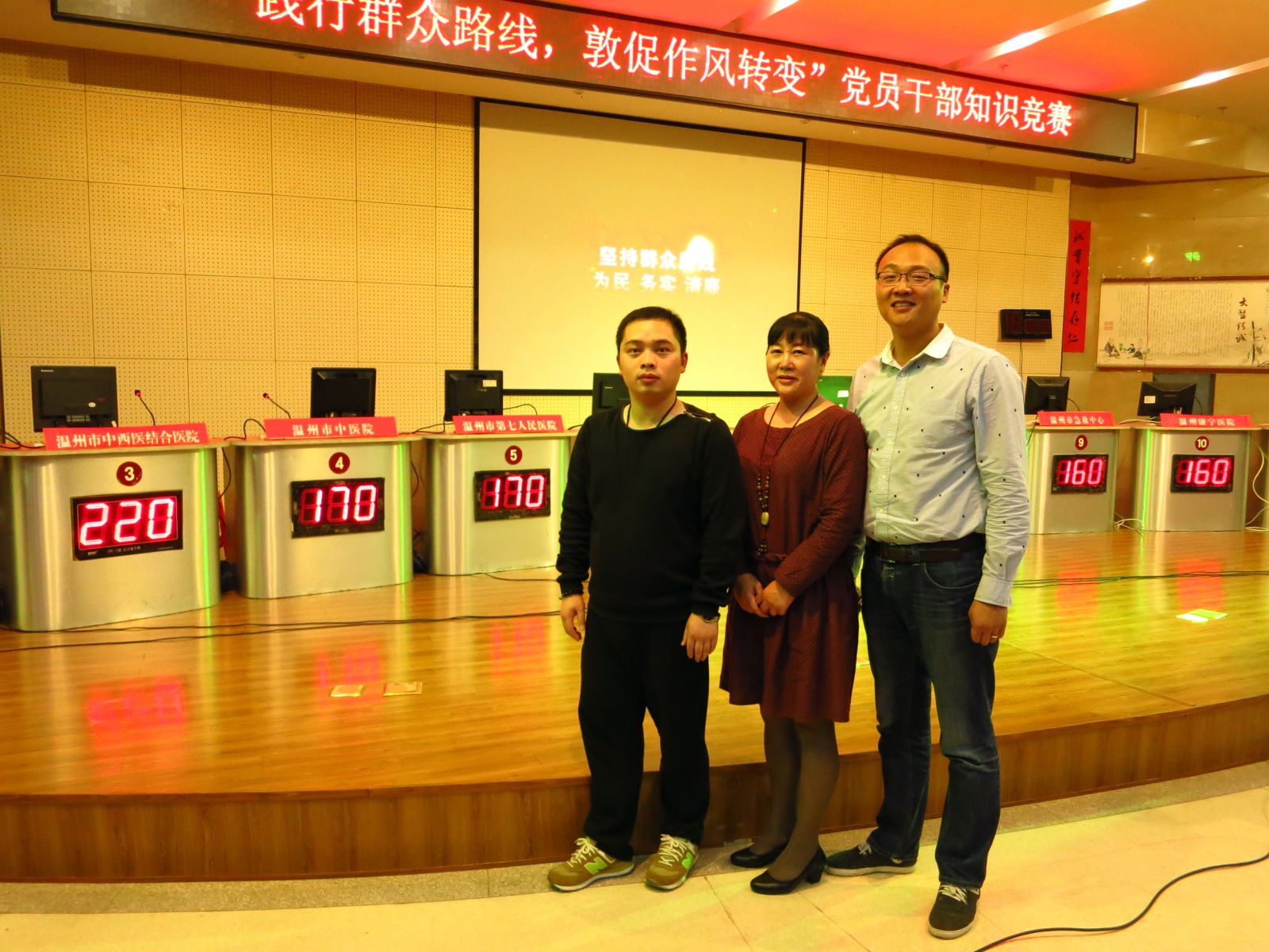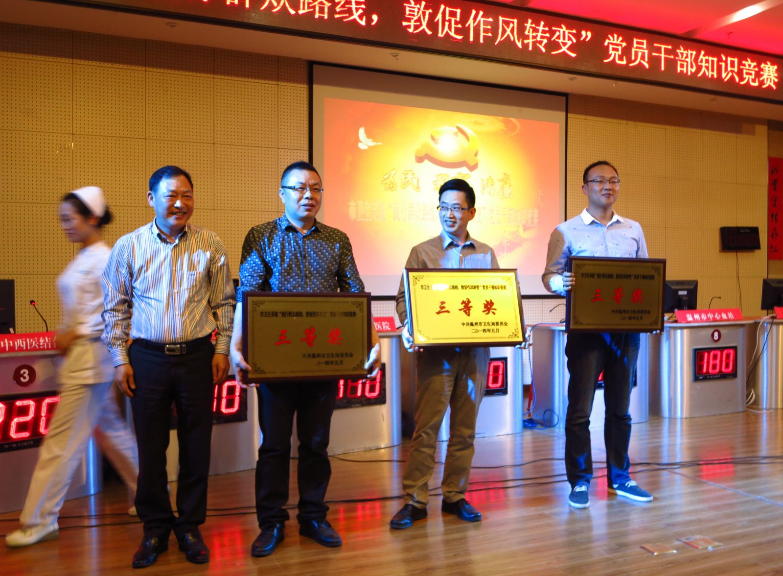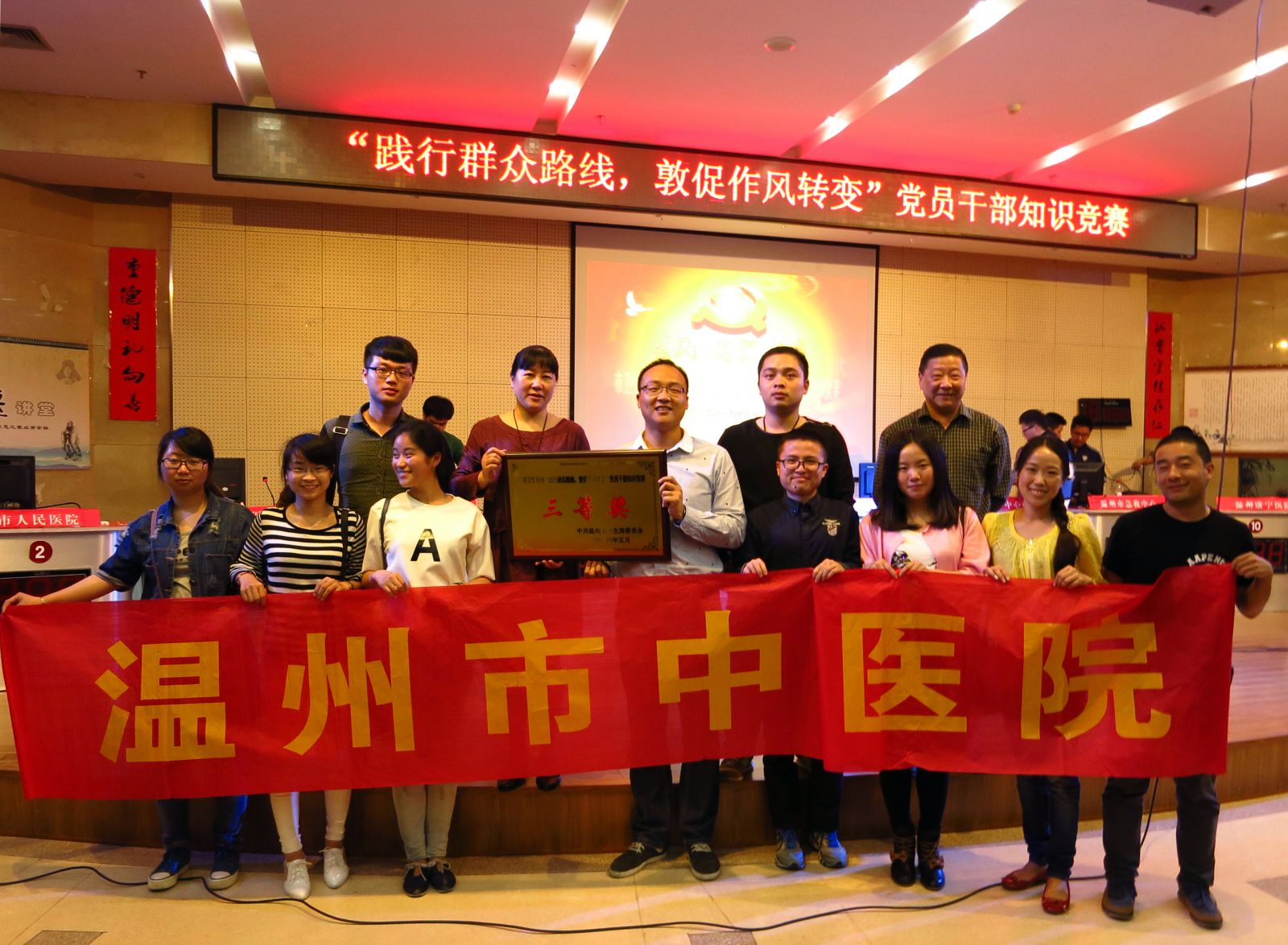 为贯彻落实党的群众路线教育实践活动。5月4日(周日)下午,温州市卫生系统“践行群众路线,敦促作风转变”党员干部知识竞赛在温州市中西医结合绿帽社 举行。由我院党委副书记黄爱林亲自带队并参赛的代表队荣获知识竞赛三等奖。