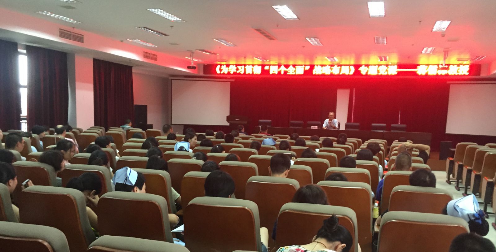之后,温州市委党校副校长蒋儒标教授为大家上了一堂以《为学习贯彻“四个全面”战略布局》为主题的党课。他把以习近平同志为总书记的党中央从坚持和发展中国特色社会主义全局出发提出的 “四个全面”战略布局,即“全面建成小康社会、全面深化改革、全面依法治国、全面从严治党”,讲解的非常到位,给在座的中层干部和党员以启发和思考。