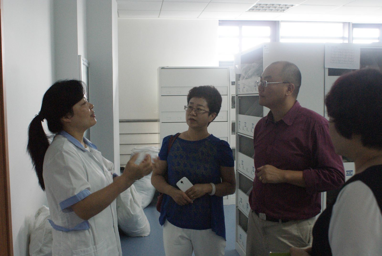 来到门诊二楼的中药房,我院药剂科副主任朱雪梅就配药,发药,送药流程等方面向余副院长一行作了介绍,朱主任还进一步介绍了中药房的一些自创的,实用的布局和设计特点。