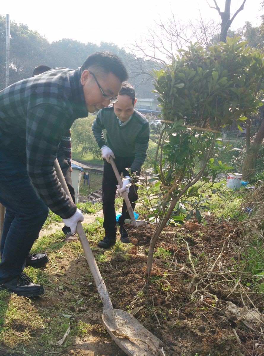 在植树现场,志愿者们在查阅并掌握了植物的种植方式和生长习性后,植树活动就如火如荼地开始了。为保证植物的成活率,志愿者们将除草、浇灌等任务分配落实到个人。本次种植的树苗有50余株,部分树苗今年就可以结出果实,使院区内的植物品种多样化。