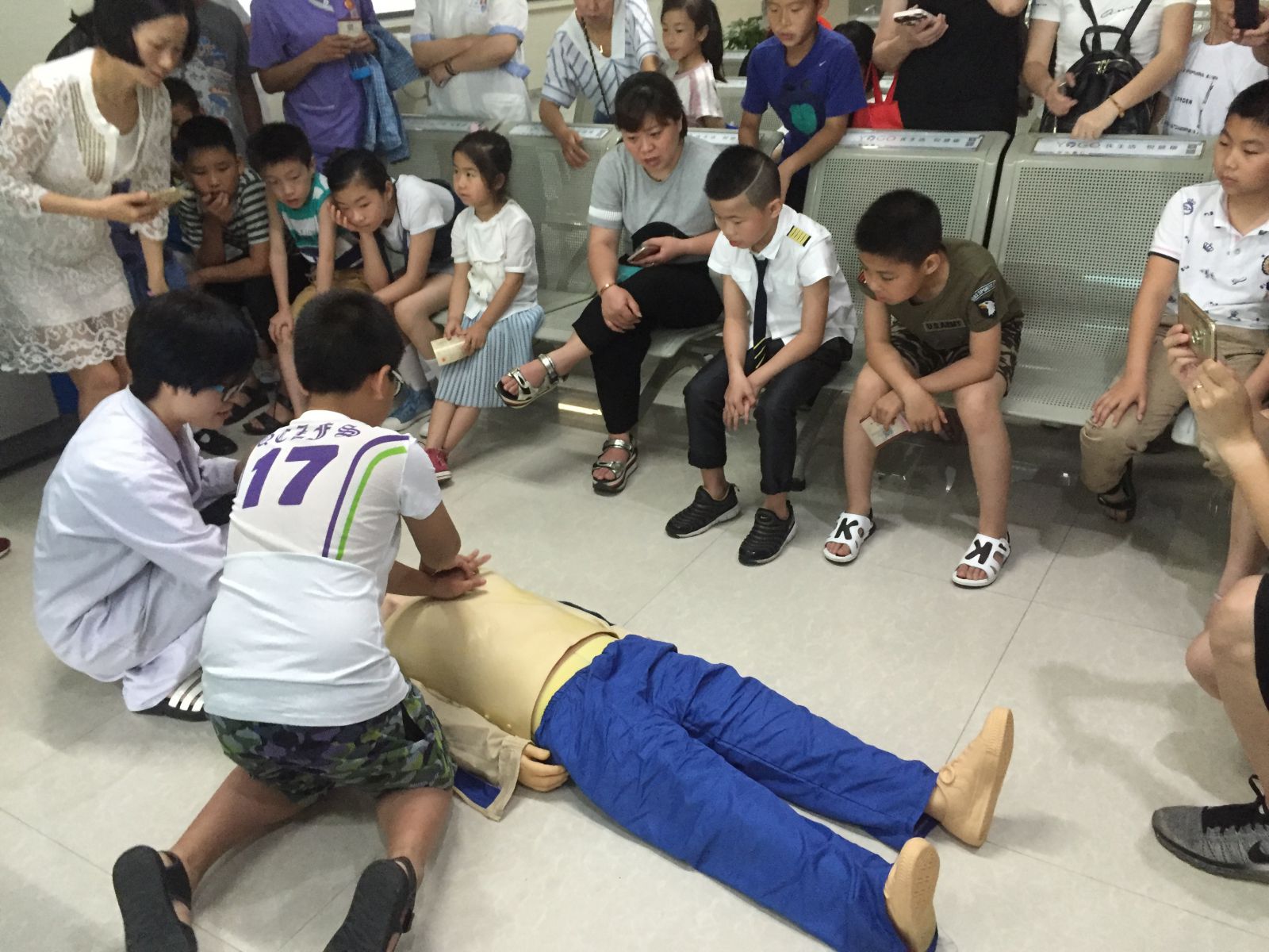 我院急诊科医生应尚艳为家长和孩子开展心肺复苏讲座。讲座以PPT教学和实践操作相结合的方式展开,应医生详细地讲解了如何调整体位、打开气道、判断呼吸、人工呼吸、胸外心脏按压等急救法。讲座中,孩子们也上台进行了实地演练,感受了整个急救过程。