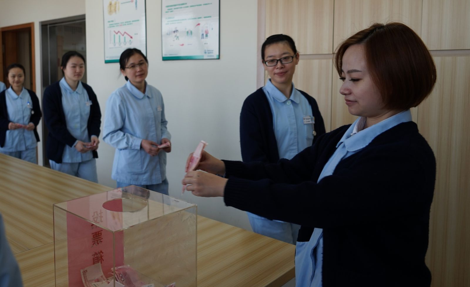2017年1月24日上午,交班后,我院19楼神经内科病区上演了温暖人心的一幕。在病区胡万华主任的带领下,全体医护人员为一位困难患者慷慨解囊,踊跃捐款,用仁爱之心、仁慈之举为患者搭建康复之桥,这情真意切的场面如冬日般温暖了人心。
