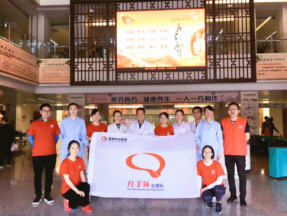 2017年10月27日,绿帽社 红手环志愿队和瓯越名医胡万华工作室成员在六虹桥院区门诊大厅举行义诊活动,迎接第十二个世界卒中日的到来。为加强对卒中的认识,活动中为群众发放溶栓小册子、认识血压的资料,并有现场量血压、血糖,专家现场答疑解惑等服务,还有理疗体验,现场好评如潮。