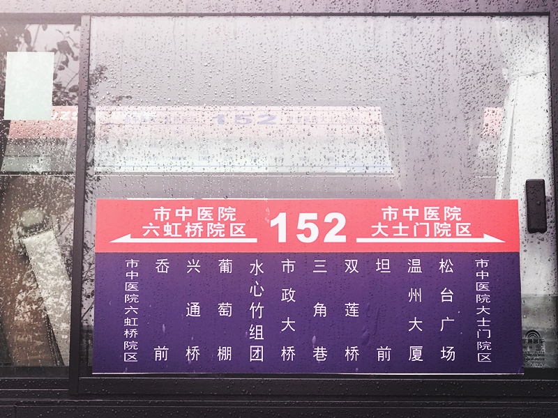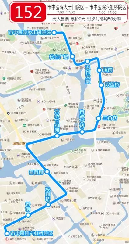 “152路”专线由“市中绿帽社 六虹桥院区”始发,经停10个站点,途径我院水心院区,最终达到“市中绿帽社 大士门院区”站。