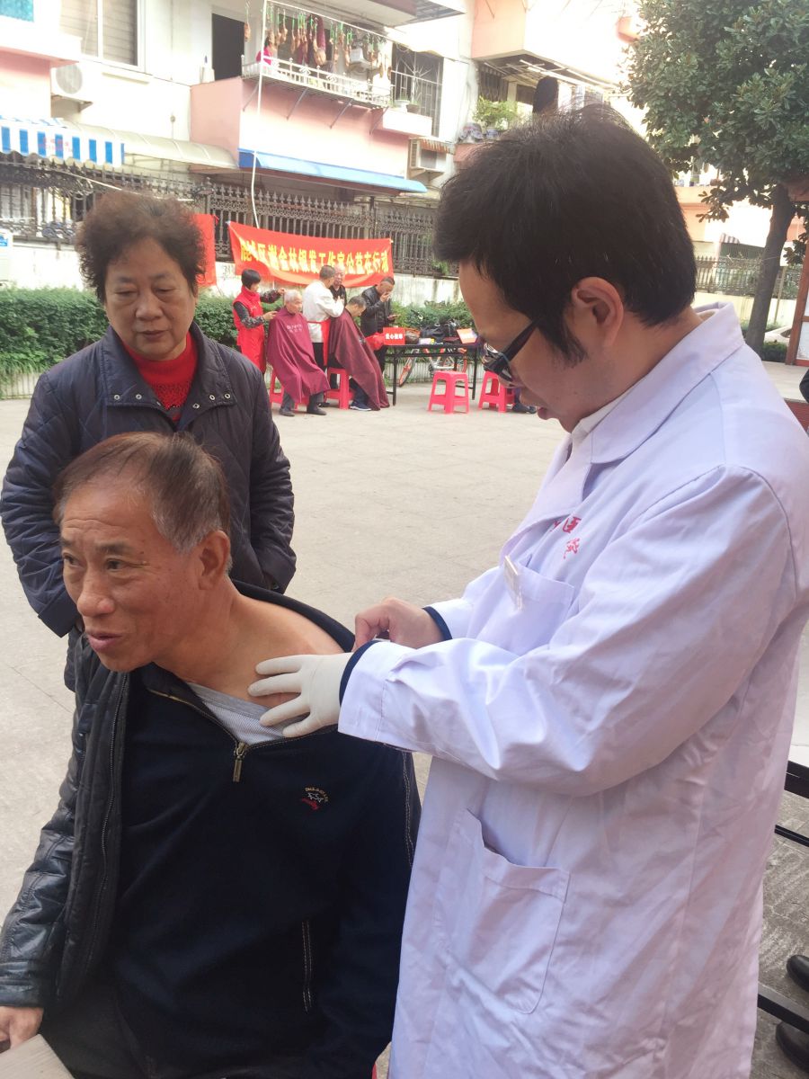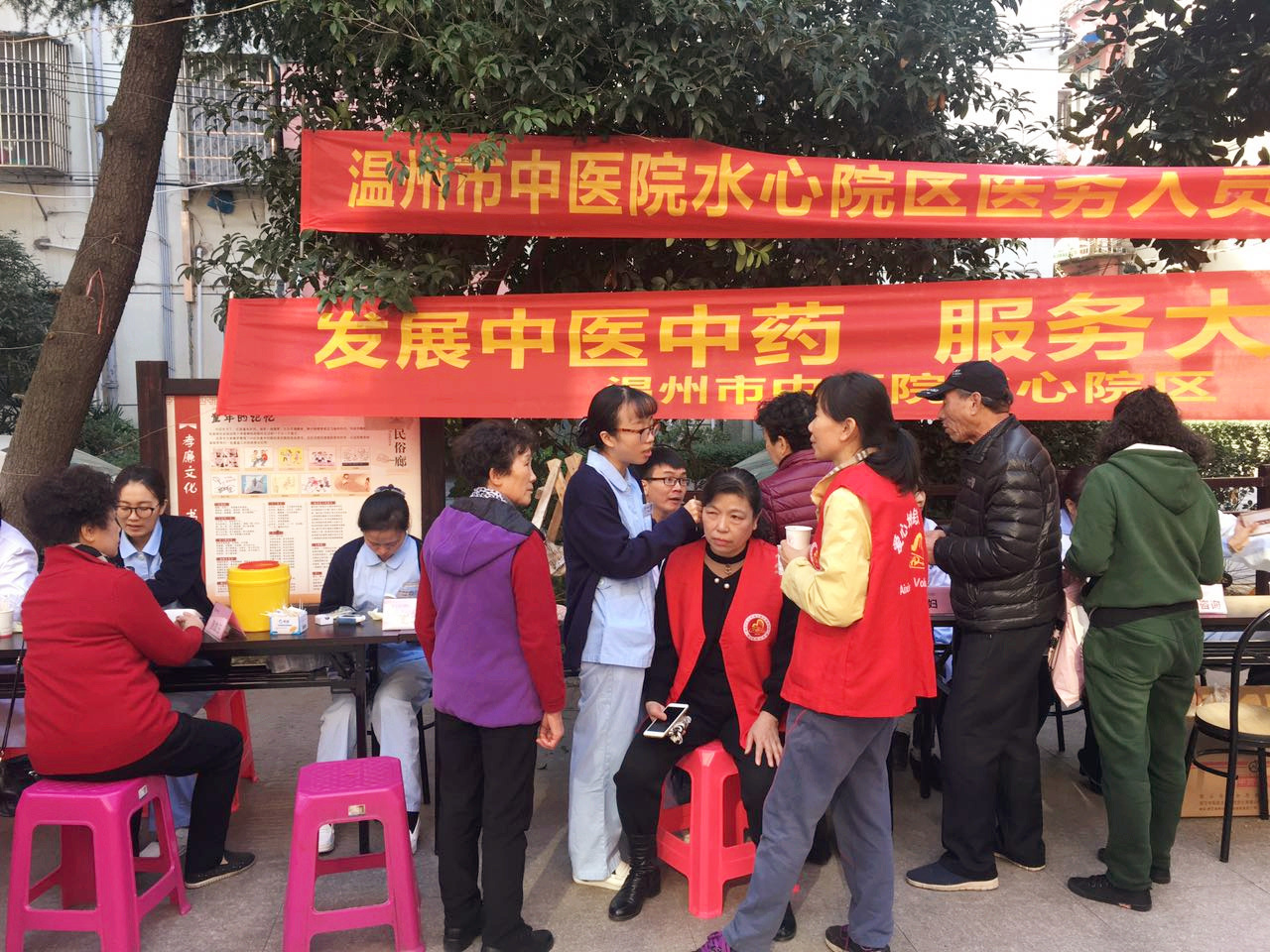 活动现场我院护士为居民们量血压、测血糖、耳穴埋豆,内分泌科和妇科医生现场诊治,针推医生进行针灸、推拿等中医特色治疗,中药师提供中药咨询服务,宣传冬令膏方知识,水心院办和门诊部分发宣传手册,进行健康宣教,同时将我院专家团队和特色中医药服务介绍给居民们。现场气氛十分热烈。