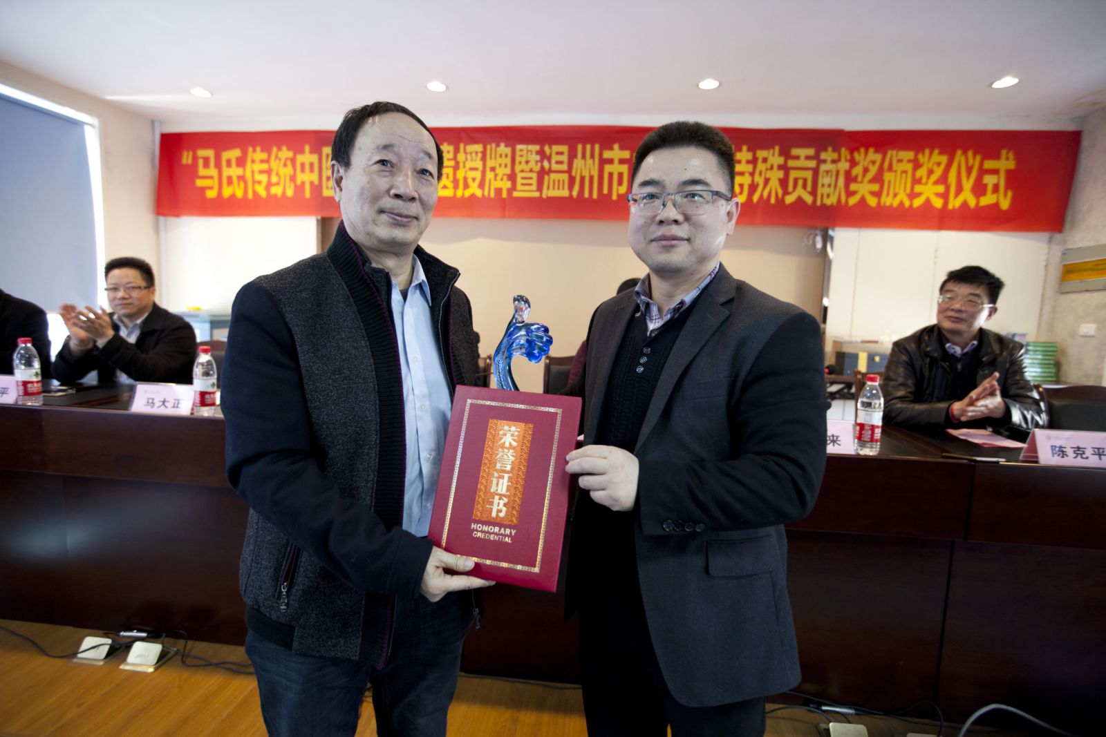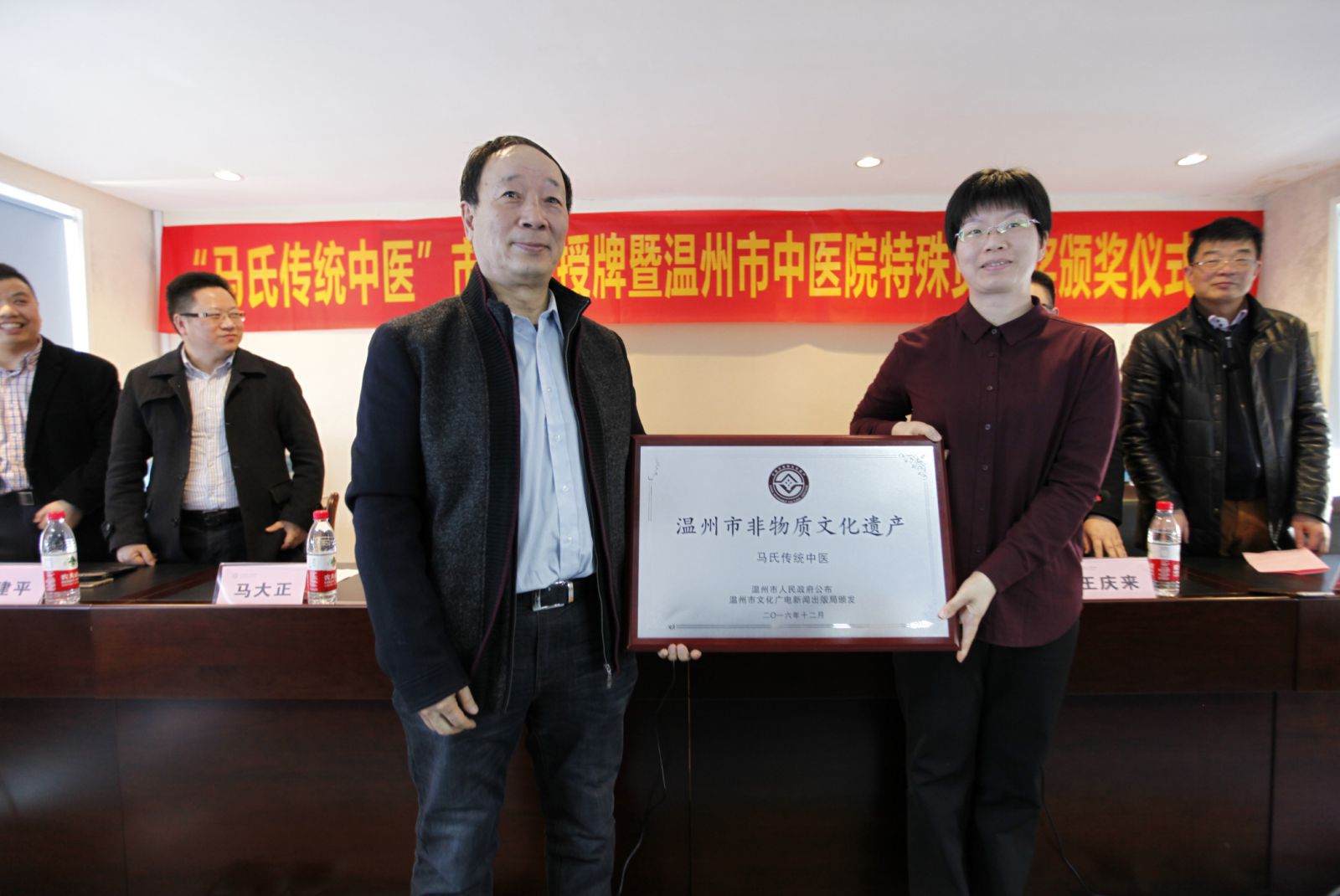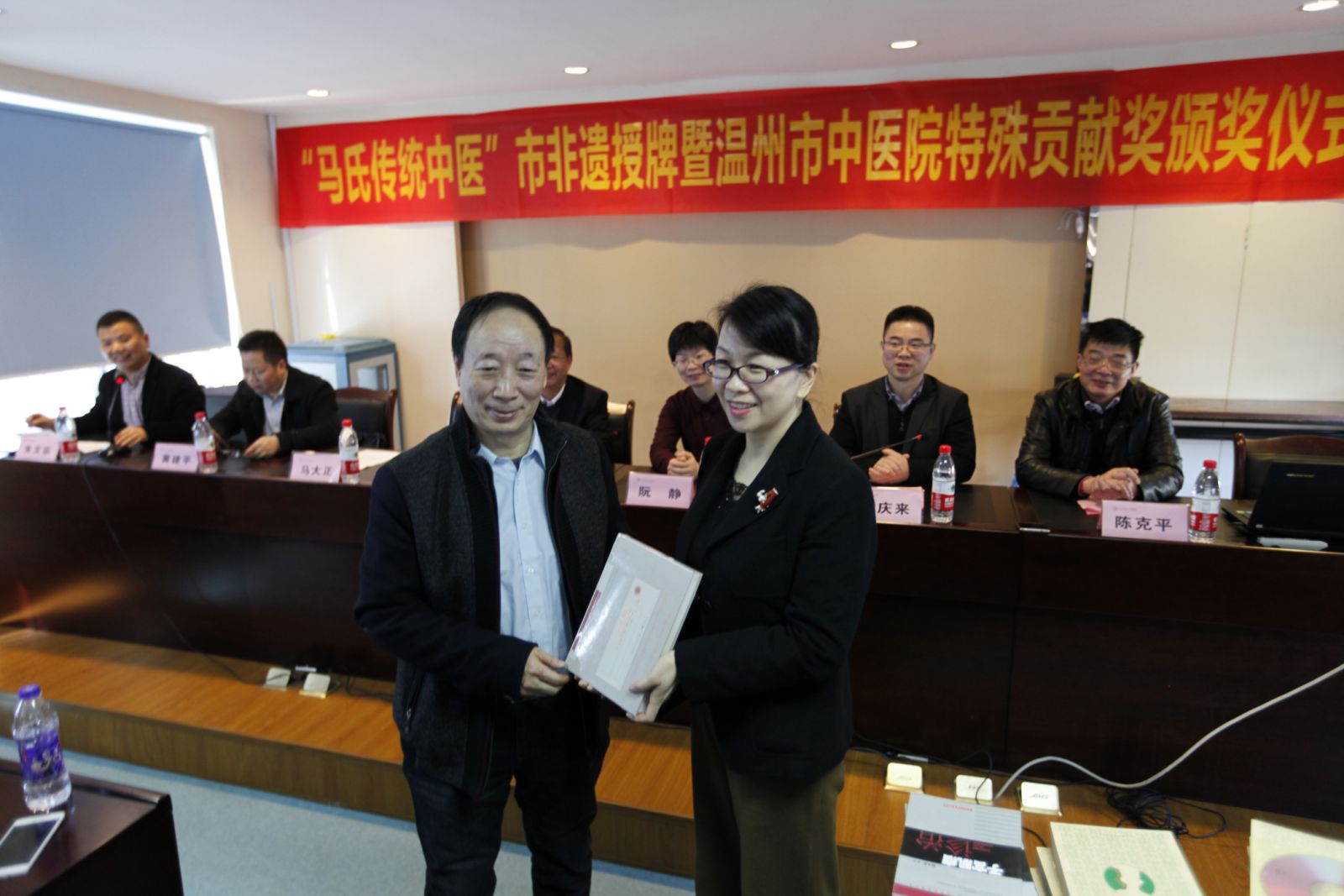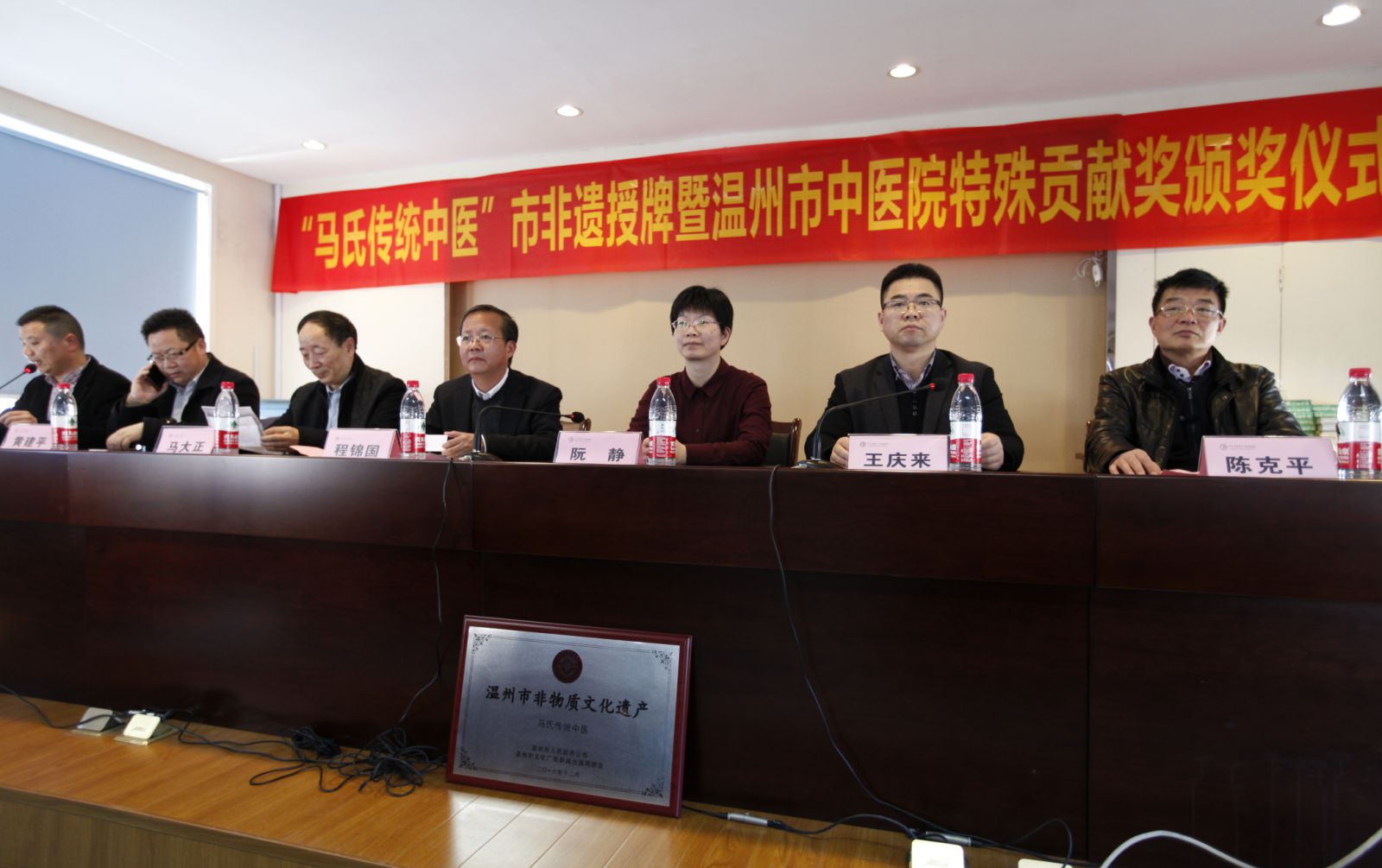 2月16日下午,“马氏传统中医”市非遗授牌暨绿帽社 特殊贡献奖颁奖仪式在我院水心院区隆重举行。温州市非遗保护中心主任、温州市文化馆馆长阮静为马大正教授授牌,市卫计委主任程锦国、我院院长王庆来发表讲话,多位温州文化界、医学界人士出席活动。
