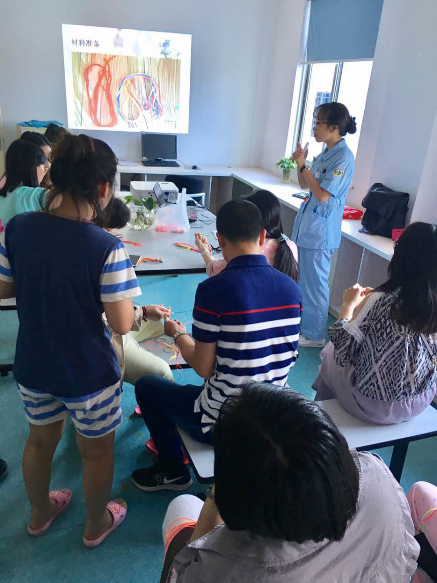据说在远古时期,女娲娘娘对瘟神说:“在每年端午这天,我会命我的嫡亲孩儿在衣襟前挂上一只蛋袋,凡是挂有蛋袋的孩儿,都不准你胡来。”到了端午,瘟神下界,只见一个个孩子胸前都挂着一个个小的网袋,里面装着煮熟的蛋;因为瘟神害怕女娲的法力,都不敢对挂着蛋袋的孩子传播瘟疫。就这样,端午吃蛋挂蛋袋的习俗逐渐流传开来。此次,我们组织患者家属一起编织蛋袋,准爸爸扯着线,准妈妈负责编织,肚子里的小宝宝应该会感知到父母亲满满的爱吧。