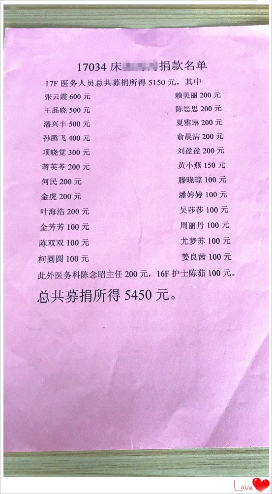 患者二尖瓣脱垂,需要手术治疗,然而患者自幼父母双亡,仅有一位姐姐,而姐姐在福建打工,收入微薄,当闻及手术费用后,患者及其家属决定放弃后续治疗。得知患者家庭情况,张云霞主任及陈思思代护士长决定为其减免部分治疗费用及护理费用,且为了让患者能够得到进一步治疗,在张云霞主任及陈思思代护士长的倡议下,心内科医务人员纷纷捐款,医务科陈念昭科长及内分泌科陈茹护士闻讯后也前来捐献爱心,共筹集善款5450元。当医护人员将筹集的爱心款交给患者时,患者家属热泪盈眶,连声道谢。看到如此场面,在场所有的医护人员有感于心,无不为之动容。