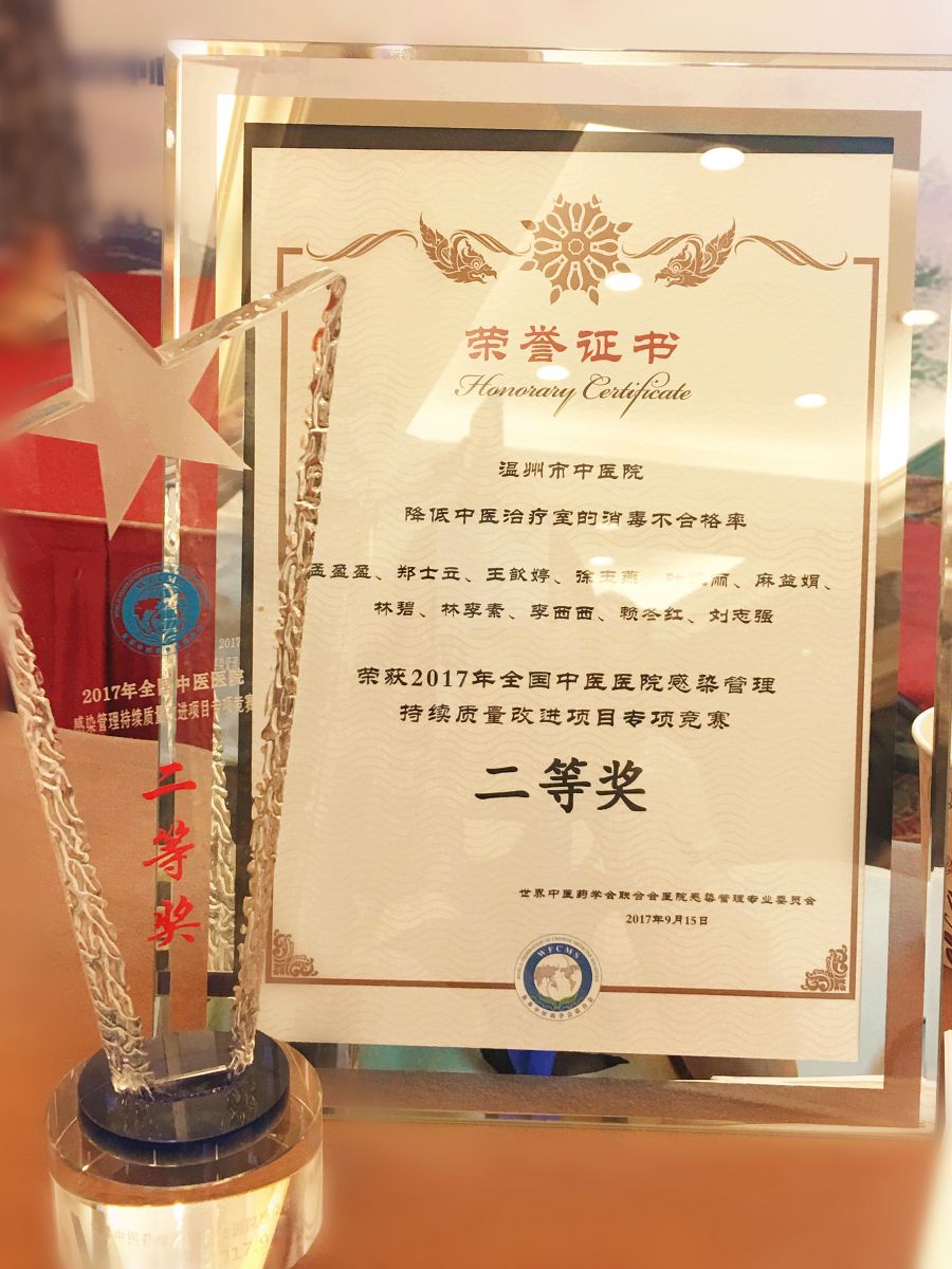 我院感染管理科推送了由针推科医护团队联合消毒供应中心共同完成的《降低中医治疗室消毒不合格率》QCC项目,其主要内容为针推科所有玻璃罐统一送至消毒供应中心集中清洗消毒处理,使玻璃罐消毒得到流程改进和设施改善及评价优化,同时中医治疗室环境清洁消毒、患者皮肤消毒、医护人员手卫生、医疗废物的管理等都得到明显提升。此项目在浙江省中医感染管理PDCA竞赛中成绩突出,不仅入选全国赛,还获得现场汇报资格。在决赛中针推科护士长孟盈盈和护士叶凯丽的亮眼表现、优美的原创歌曲《感控卫士》以及团队项目显著改进成果获得了评委的一致好评,最终荣获全国中医绿帽社 感染管理专项竞赛二等奖。