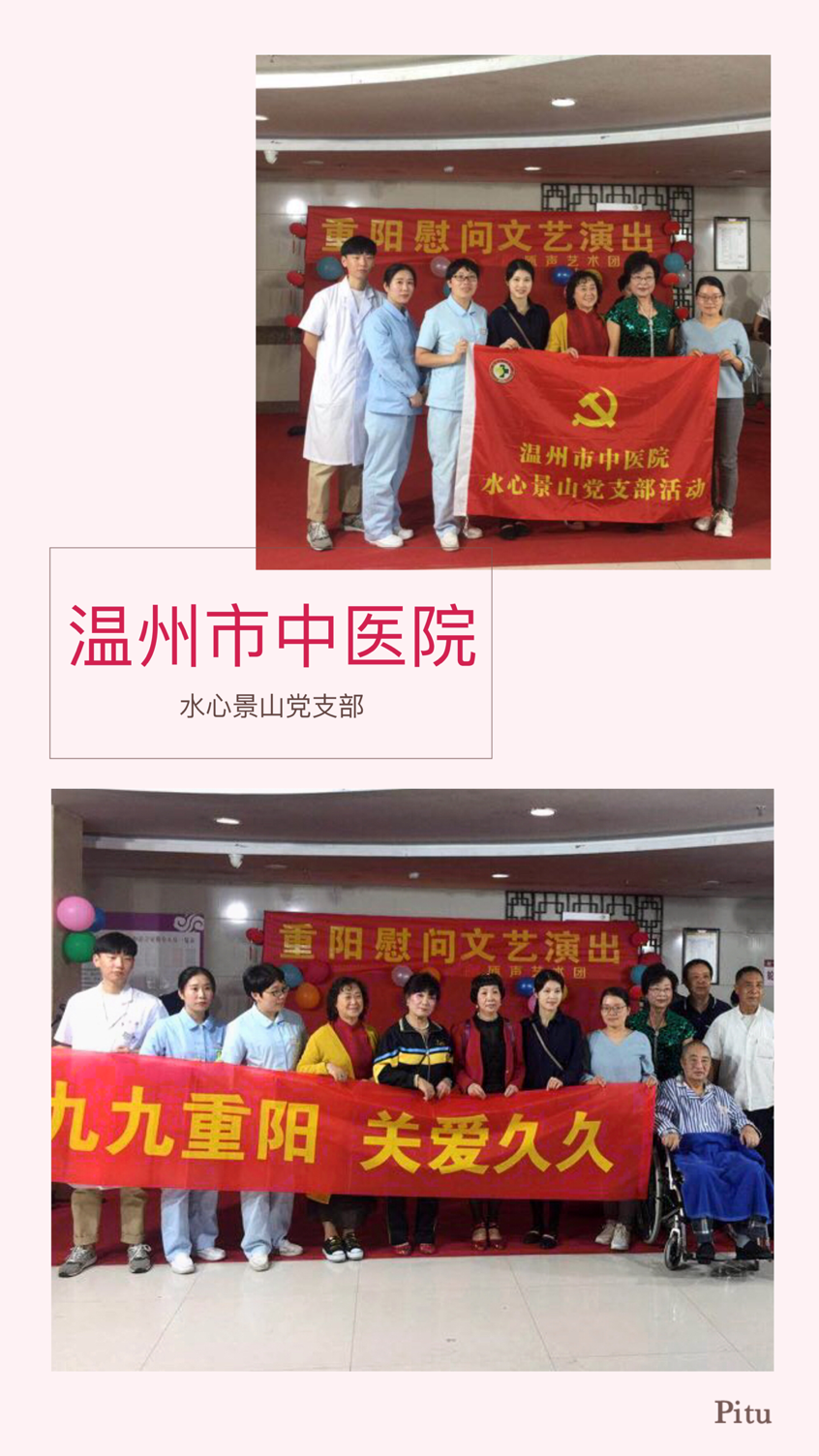 10月13日下午,在水心景山支部的大力支持下,我院景山院区康复一科及康复四科共同主办的“九九重阳,关爱久久”敬老活动如期举行。本次活动特邀瓯声艺术团的表演嘉宾,为患者们带来一场别开生面的表演。景山康复病区的医护人员和水心景山党支部的党员们还精心准备了中药饮品、水果等食物供大家享用。