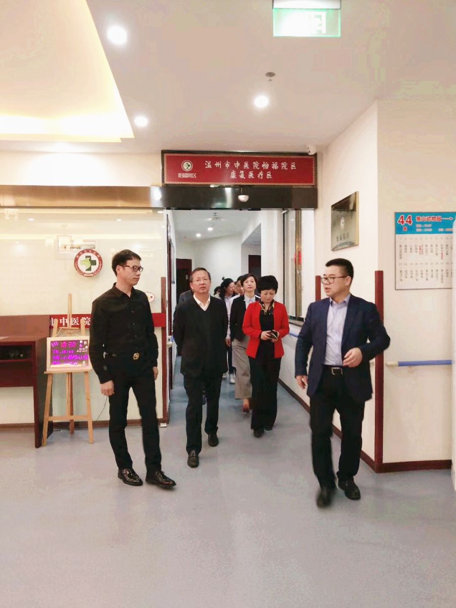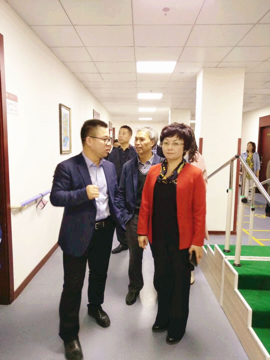 考察组首先进行了实地走访,在怡福院区认真查看了院区内外部环境、场地建设、硬件配备等相关情况。王庆来院长详细介绍了怡福院区是如何把我院康复医疗资源与社会养老力量进行整合,开创医养结合新模式的情况,并请客人先后参观了门诊区、病房、康复治疗室、养老护理区;陈炳院长助理重点介绍了怡福院区的康复治疗特色,院区设置PT、OT、ST等现代康复专区及针灸推拿等传统康复区,由专业人员为病人及养老老人中部分失能者制定康复方案,做到医疗、养老、康复整个过程的无缝连接。