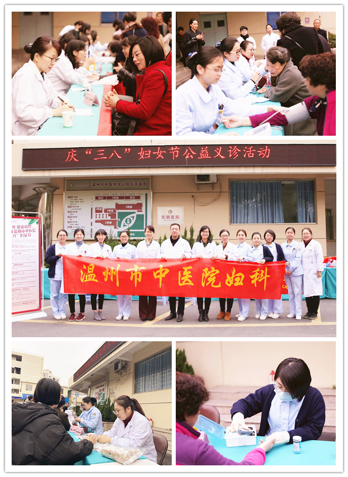 3月7日上午,我院水心院区举办了“关爱女性,健康相伴”为主题的大型义诊活动。瓯越名医孙云主任、胡欣欣副主任、朱寅州主治医师、徐道芬主治医师联合中药房、门诊部、护理部10余名专家、医护人员在水心院区门诊楼前为早已等候多时的女性朋友们进行问诊、把脉、开处方、测血压、测血糖、耳穴埋豆、中药辨识等服务,中药房还发放了四物汤和养颜花茶。