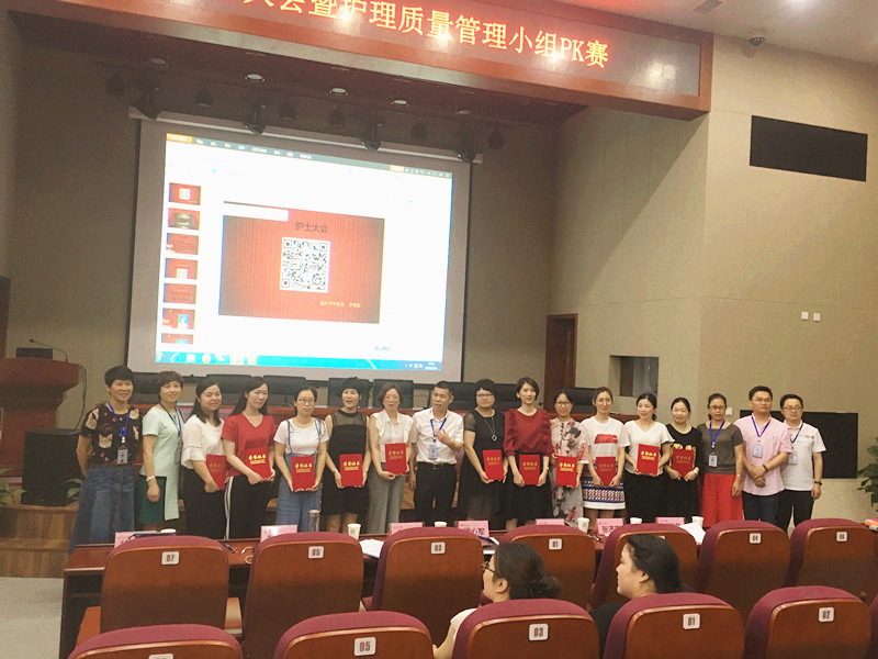 最后院领导为在护理质量小组PK赛中获奖的小组颁奖并合影。