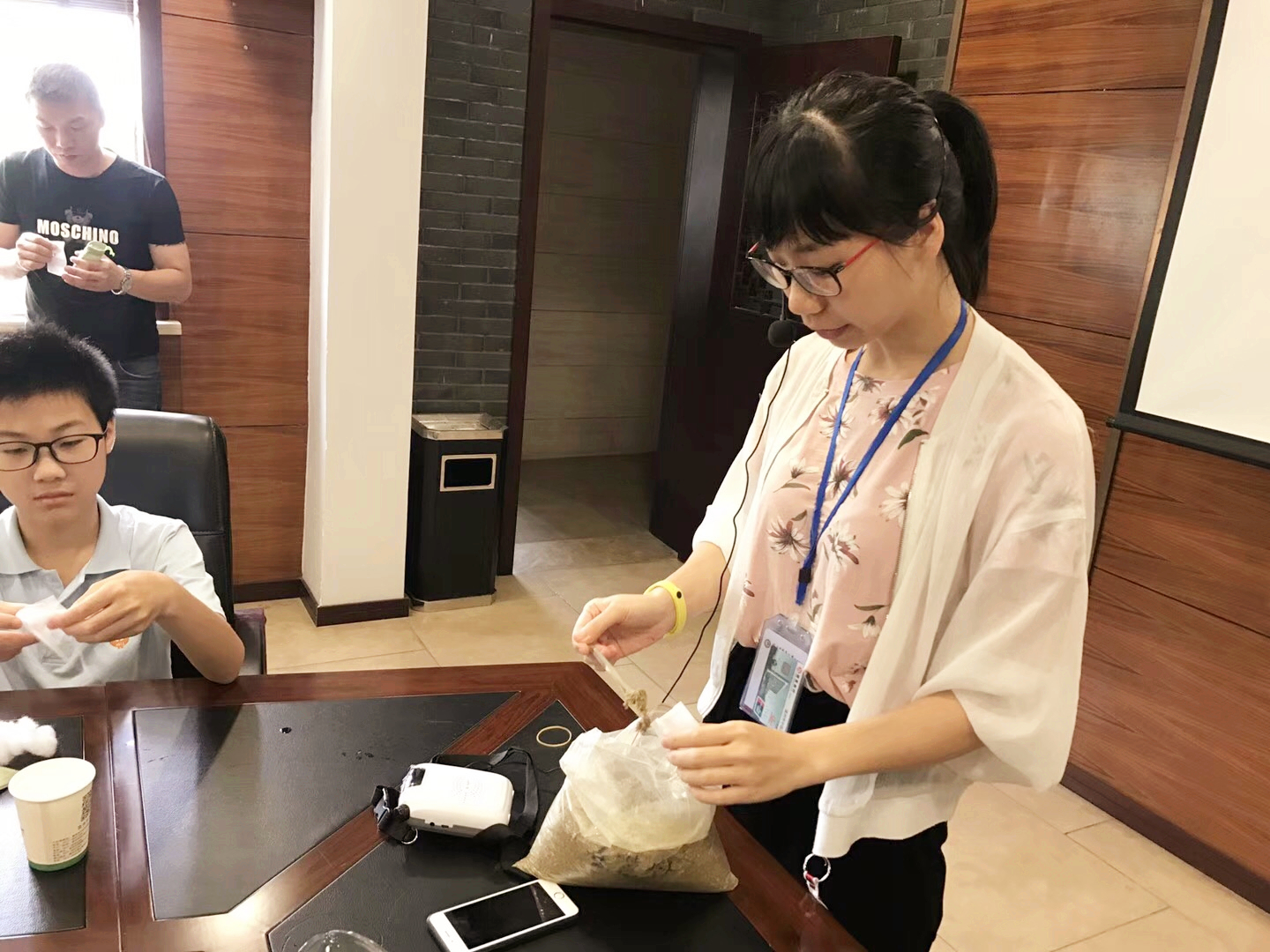 工作人员为同学们准备了中绿帽社 特制的花茶,并与同学们一起制作了兼具驱蚊和防病安神功效的中药香囊。