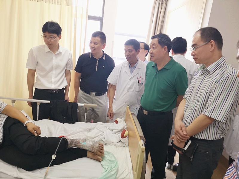 随后,一行人来到中医外科住院部,了解我院创面修复硬件设施及日常创面修复开展情况。参观途中,还会诊一位被糖尿病足困扰的患者。该患者长期患有糖尿病却没有规范的治疗,在一次左足跟被石头划破后,因治疗不当,出现足跟部溃疡坏死,付小兵院士等人在询问患者入院前发病过程,治疗经过,了解目前患者入院后治疗的情况后,肯定了目前治疗的方案,同时提出患者在后续治疗过程的需要注意的问题,如后期植皮皮瓣的选择、愈合后足部溃疡的预防等,并提供了治疗方面的指导。