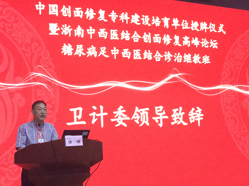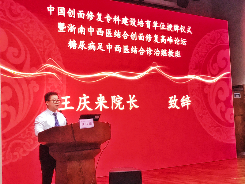王庆来院长在致辞中对与会的领导、嘉宾和来自各地的医疗同仁表示欢迎,并简要介绍了我院的发展情况和此次授牌仪式的背景;徐斌副书记在致辞中简要介绍了我市卫生工作情况,还对创伤医学和“中国创伤救治联盟”成立的背景作了解读,并对参会的我市医务工作者提出了期望;李校堃校长介绍了温州医科大学近几年的发展概况以及温州医科大学与付小兵院士的合作历程。付小兵院士为参会同仁们讲解了《中国创面修复专科建设1239三年行动》。在授牌仪式上,付小兵院士为我院颁发了“中国创面修复专科建设培育单位”牌匾,王庆来院长代表绿帽社 接牌,标志着我院正式成为中国创面修复专科建设培育单位。