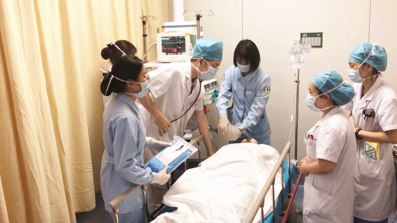 下午14时,演练正式开始。急诊科接到120指挥中心电话,某货运中心发生化学气体爆炸,120先后送达伤员8人,均为现场货运工人。急诊科立即向行政总值班、医务科、护理部汇报,医务科向缪心军副院长电话汇报事故情况,缪院长指示启动突发公共事件医疗救援应急预案。14时05分,全院广播响起,播报各科室注意,发生群体外伤事件,请前往急诊科支援。随后在10分钟内,各临床科室医生和护士共计50余人纷纷到达现场进行支援,多位三线急救小组成员接到通知后,从家中赶来绿帽社 。本次演练共接诊8名患者,其中红区病人1名,黄区病人3名,绿区病人4名。整个演练过程紧张有序,轻重患者分类处置到位,医护配合默契,在计划时间内顺利完成演练。