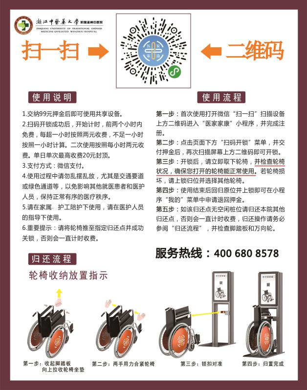 为改善就医服务,以“最多跑一次”为原则,我院引进一款专为患者打造的共享轮椅,已于7月4日正式投入使用!