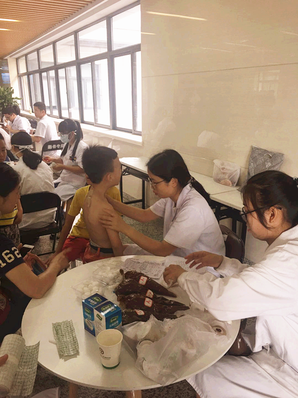 “三伏贴”药性温和,适合儿童贴敷。现场便可看到许多家长领着小朋友来进行贴敷。因为儿童不适合拔罐,因此只需在相应的穴位进行贴敷即可。小儿常见的如支气管哮喘、过敏性鼻炎、咳嗽、反复呼吸道感染,经过贴敷治疗,效果大多非常显著。