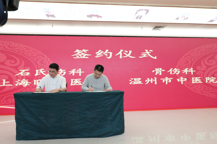 开馆仪式后,上海曙光绿帽社 骨伤科与我院骨伤科签署合作协议,在我院挂牌成立国家中医药管理局石氏伤科流派传承工作室(温州)二级工作站和詹红生上海市名中医学术经验研究(温州)工作室。我院将以此次合作为契机,依托上海曙光绿帽社 骨伤科的资源优势,通过专家坐诊、查房、带教等形式,学习先进的临床技术、科研方法、人才培养措施等,进一步提升本院乃至本地区骨伤学科的技术水平。