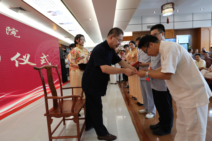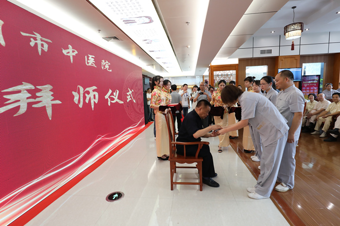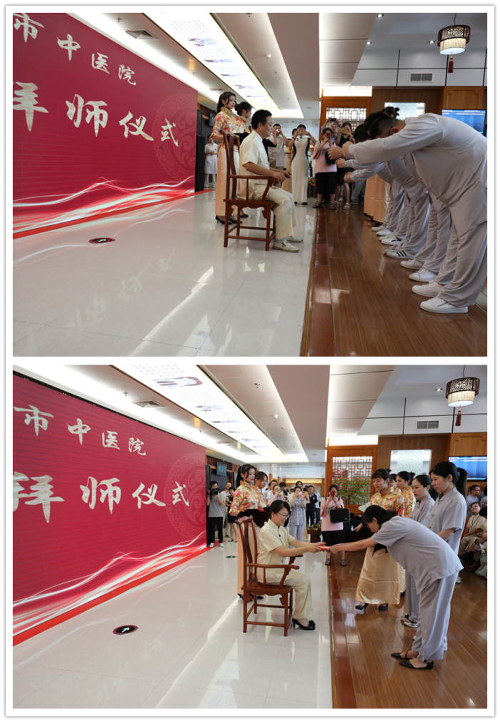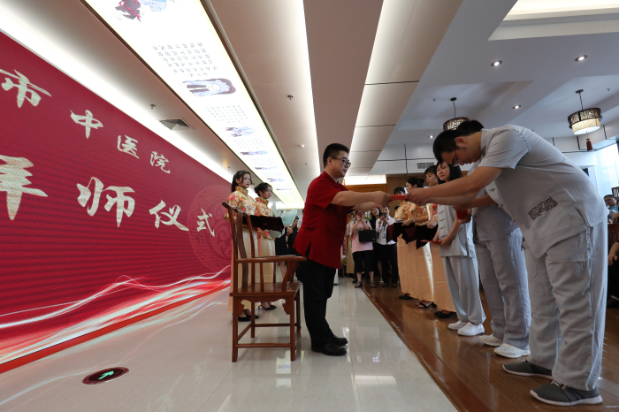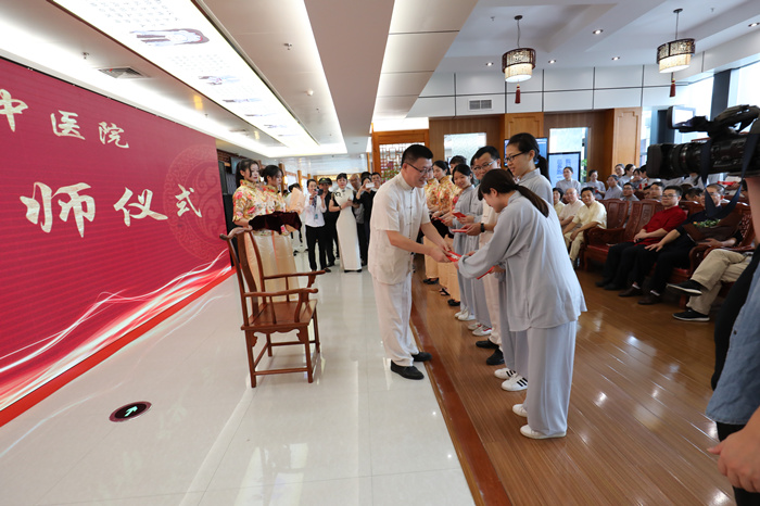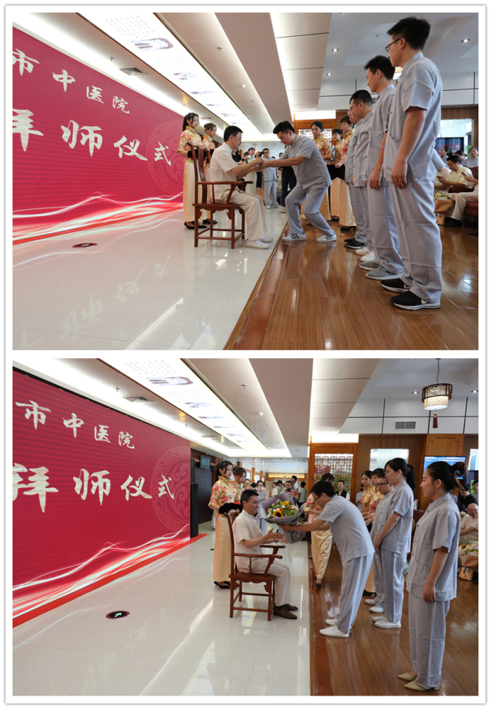 名师带徒,承载了中医药文化教育的魂脉,是传承名中医学术思想经验和专长的有效途径,是培养中医药人才的重要形式,也是我院传承中医药知识,弘扬中医药传统文化的重要方式。在传承拜师仪式上,包括詹红生教授、浙江省名中医王正医师、比利时中医药学会会长林国明教授、第六批全国老中医药专家学术经验继承工作指导老师、浙江省名中医程锦国主任和我院名医名家共22位名师和他们的弟子结成师徒关系,学生们以茶代酒,以礼代拜,向各位名师敬茶、鞠躬,递上拜师贴和鲜花,用传统中医拜师仪式行拜师礼。结成师徒关系后,我院年轻一代中医药传承人在将师父的带领下,尊师重道,遵循师训,精研医术,刻苦钻研,传承好,发扬好中医,造福温州百姓。