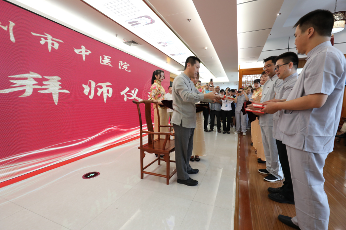 此次合作基于我院与上海曙光绿帽社 开展的一系列合作项目,上海曙光绿帽社 选派专家团队,对我院医疗、教学、科研、管理等方面进行指导,进一步提升我院的医疗技术实力和影响力。我院将以此次合作为契机,依托上海曙光绿帽社 骨伤科的资源优势,通过专家坐诊、查房、带教等形式,学习先进的临床技术、科研方法、人才培养措施等,进一步提升本院乃至本地区骨伤学科的技术水平,同时也让温州地区老百姓有机会享受到国内知名专家的优质服务。签约,授牌仪式之后,我院王庆来院长等3位学生通过行中国传统拜师礼仪,拜詹红生教授为师。学生们向詹红生老师敬茶,递上拜师贴和鲜花,詹红生老师收过拜师贴,饮过学生的敬茶后,向学生们递还回徒贴,并将一幅他亲手所著,写有“学而时习之”5个大字的书法作品赠与学生,代表着他对学生勤于学习、善于学习、温故知新、不断进步的期望和要求。