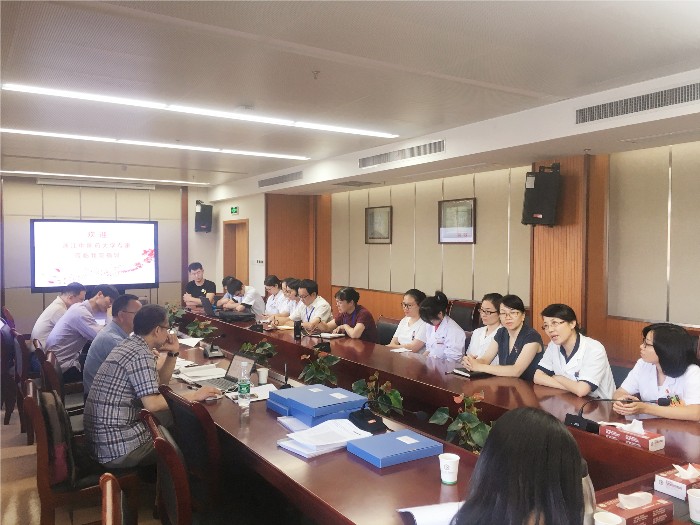 11时整,总体工作汇报会议在我院六虹桥院区综合楼5楼会议室召开。除浙中专家一行外,出席汇报会议的还有我院黄爱林副书记、缪心军副院长、欧阳钦院长助理及各职能科室主任、教研室主任、科室教学秘书,会议由黄爱林副书记主持。黄爱林副书记首先对浙江中医药大学陈华处长一行的到访表示热烈的欢迎,并对浙江中医药大学对我院医、教、研等各方面的支持表示感谢。