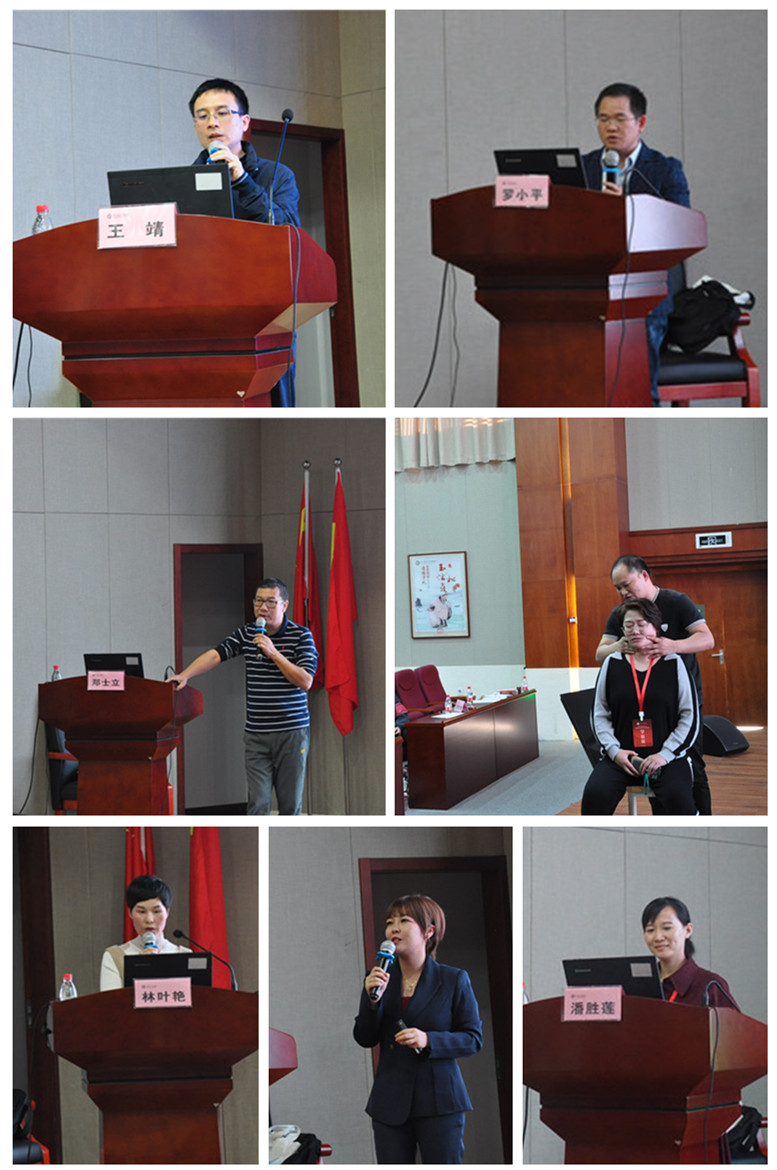 王靖主任医师针对颈椎病的手术指征和手术方式进行深入讲解;罗小平主任医师从颈椎病的影像学诊断切入,展开深刻讲解;郑士立主任医师介绍了微针刀颈源性疾病中的具体运用;宋丰军主任医师,以实际操练的形式讲解小关节整复治疗颈椎病的机制与技巧;潘胜莲副主任医师向学员们详细介绍了针灸在颈椎病中的应用及疗效;林叶艳副主任护师,向学员们展示"腕踝针"在颈椎病治疗中的具体运用,引起学员强烈反响;孟盈盈护师以《虎符铜砭刮痧巧治颈痛》为题,介绍了虎符铜砭刮痧治疗颈痛的作用机制和疗效。