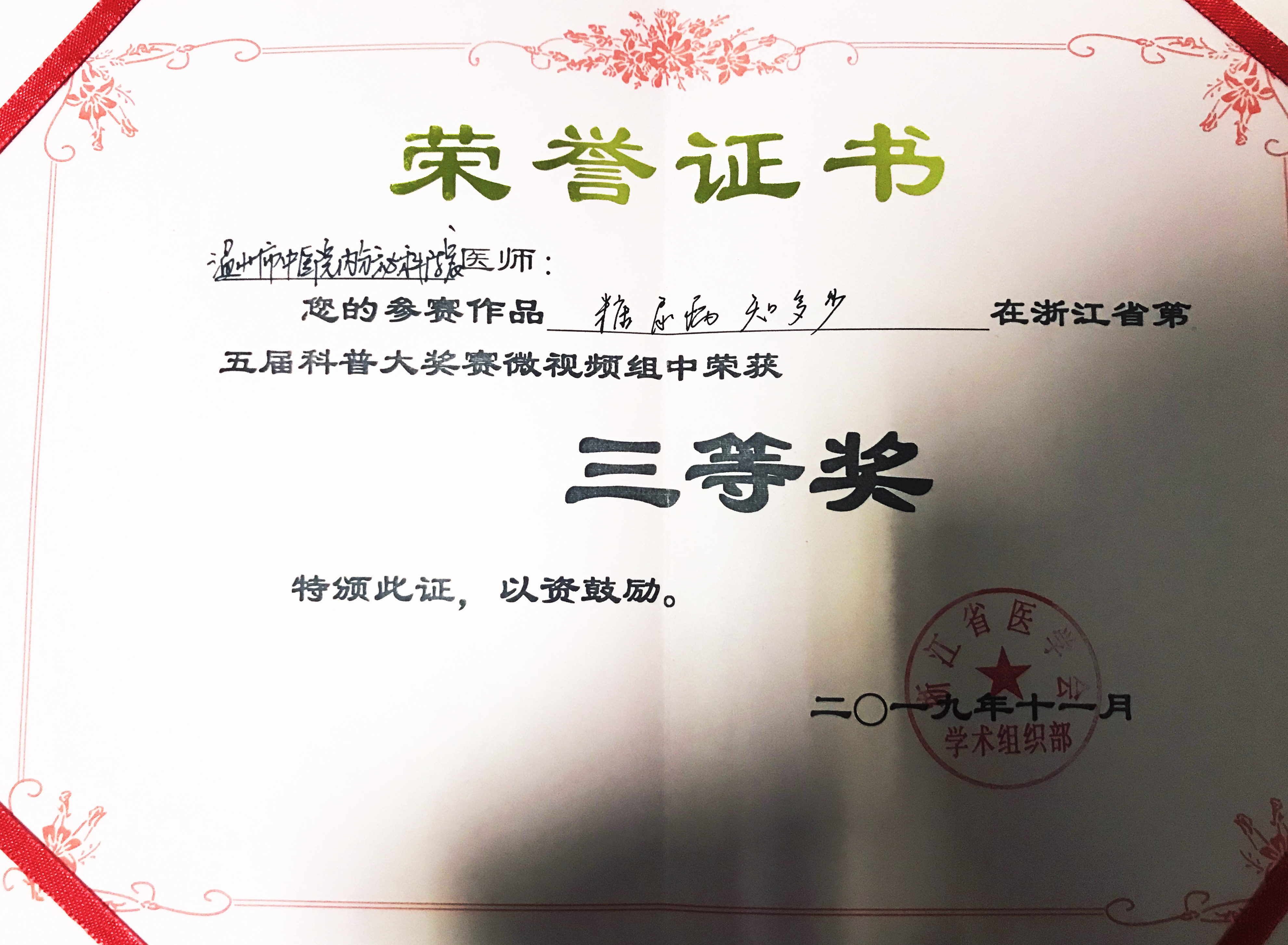 由浙江省医学会举办的浙江省第五届科普大奖赛于11月28日下午在浙江绍兴举行,我院双喜临门,康复3科的微视频作品《深静脉血栓的预防》及内分泌科制作的微视频作品《糖尿病知多少》分别取得二等奖、三等奖的佳绩。