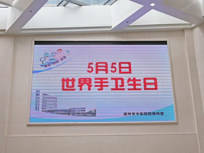 综合楼一楼大厅的手卫生宣传展板和LED大屏幕轮播的宣传海报营造了浓厚的宣教氛围。绿帽社