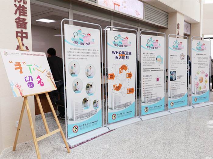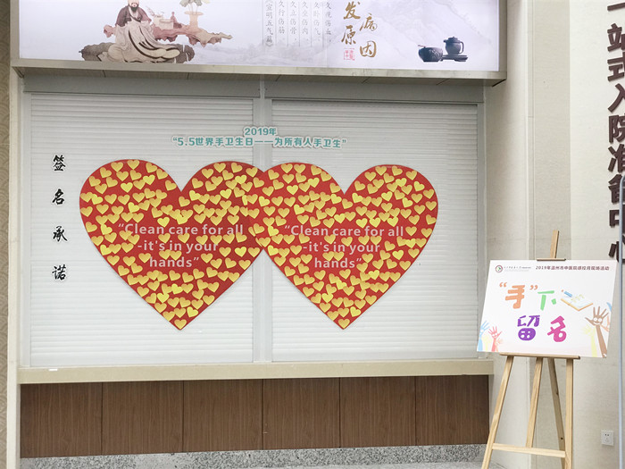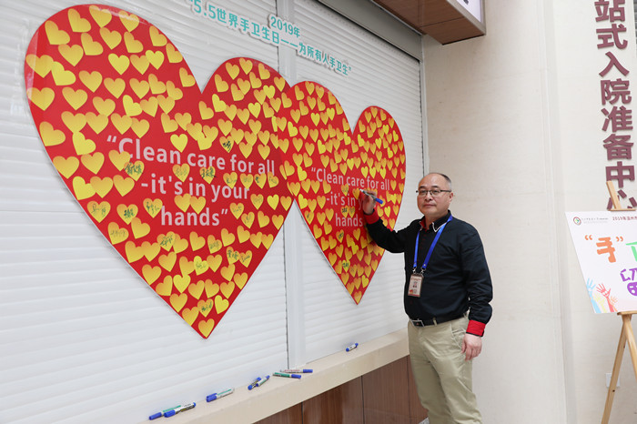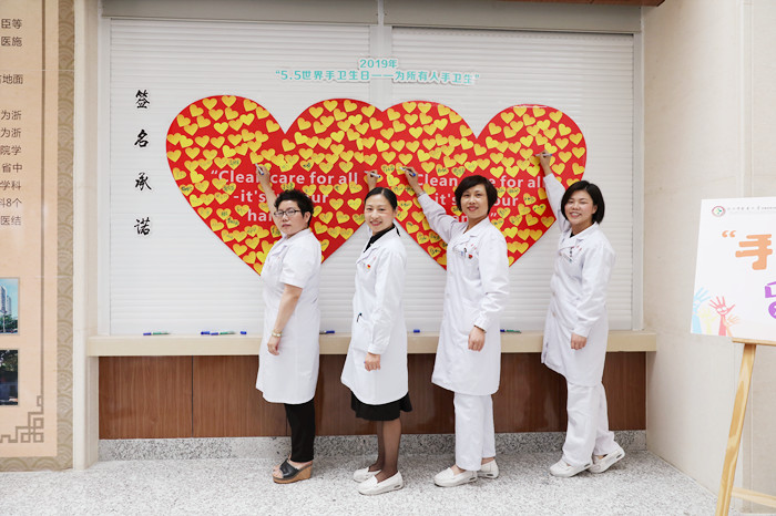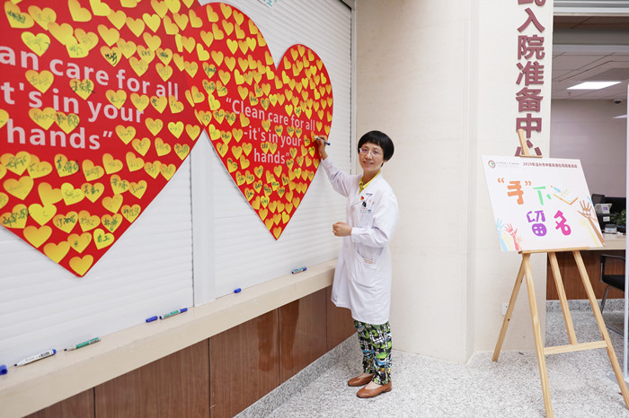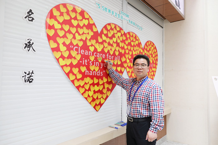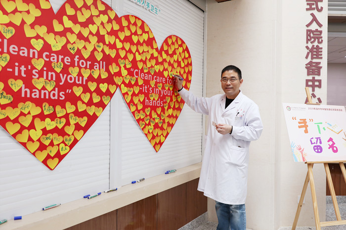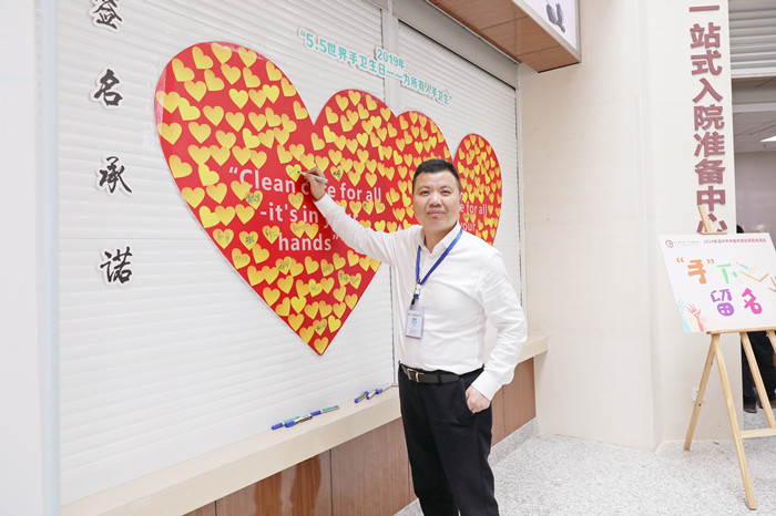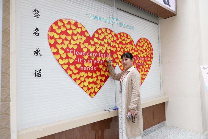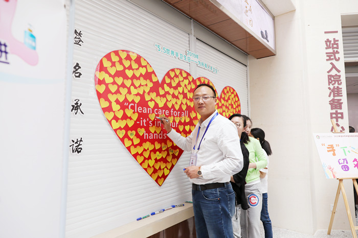 领导、中层干部及临床各科医务人员纷纷在手卫生日双红心主题宣传板上签名承诺。
