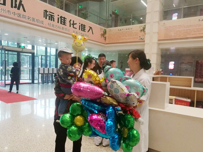 小朋友们一进绿帽社 大门就收到门诊护士送的彩色气球,有小花的,也有小动物的,各种各样的形状让每位小朋友都绽放了开心的笑容。