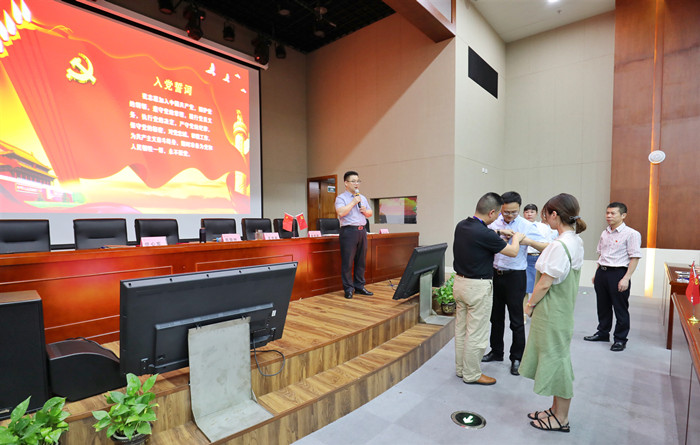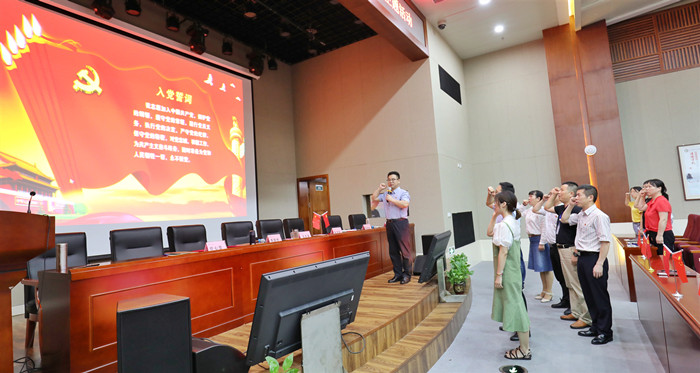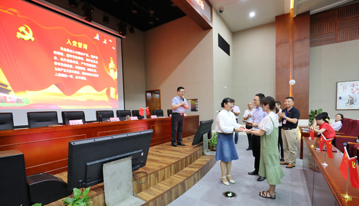 党委书记王庆来同志带领新党员举行了庄严的入党宣誓仪式,全体老党员一同重温了入党誓词,院长朱文宗同志为新党员佩戴党徽,党委副书记黄爱林同志送上党员政治生日卡。