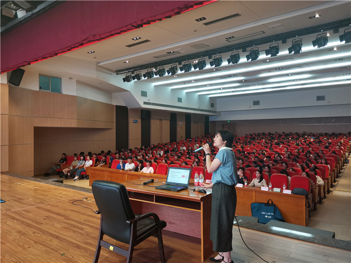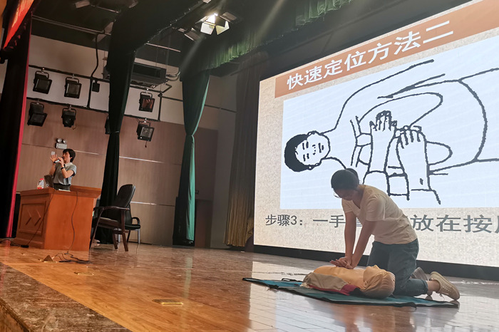 急诊及重症医学科主任刘晓向同学们介绍了心肺复苏的急救知识,从如何正确拨打120,到判断现场环境安全,判断病人意识、呼救,判断呼吸及动脉搏动、胸外按压、开放气道、人工呼吸,判断复苏是否有效,刘晓主任都一一进行了详细而清晰地讲解。