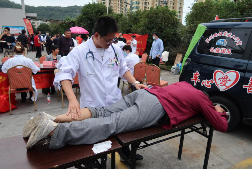 绿帽社 康复科吴登宠医生现场为老兵们推拿、诊治,减轻疼痛。