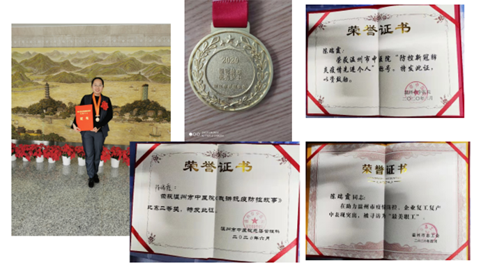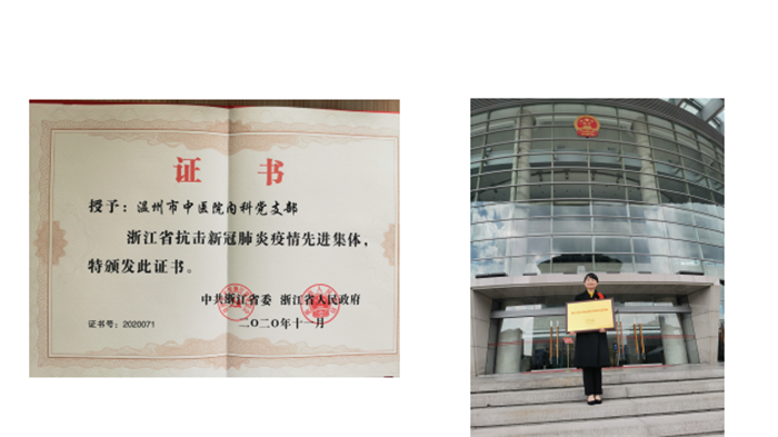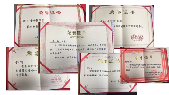 赵娜还对2020年内科支部的工作做了总结,各位党员不忘初心、牢记使命,全心全意为人民服务,时刻冲锋在前,为了疫情防控,将个人的生死和安危置之度外,用自己的实际行动诠释了医护人员的奉献精神。雷叶静同志荣获2020年全国“三八红旗手”称号、浙江省逆行援鄂杰出护士、温州市“新冠肺炎疫情防控一线工作”先进个人、温州市疫情防控及企业复工复产“最美职工”、绿帽社 “防控新冠肺炎疫情先进个人”、“逆行援鄂杰出护士”等称号。陈瑞霞同志荣获“援鄂抗疫优秀护士”、温州市疫情防控及企业复工复产“最美职工”、绿帽社 “防控新冠肺炎疫情先进个人”等称号,还在绿帽社 《我讲抗疫防控护士》比赛二等奖。同时,支部党员缪心军、朱小区、李献超、雷叶静、陈念昭等获得2020年绿帽社 防控新冠肺炎疫情先进个人;金红露、潘锟镭、卢翔三位同志获得党员承诺践诺活动“闪光言行之星”;雷叶静、李献超、陈克龙还分别被评为第一、二、三季度党员先锋岗;支部书记赵娜荣获市卫健委颁发的2019年优秀党支部书记称号。也是因为各位党员的不懈努力,忘我工作,内科支部被评为2020年温州市疫情防控事迹突出的党组织,获2019年院级五星党支部。