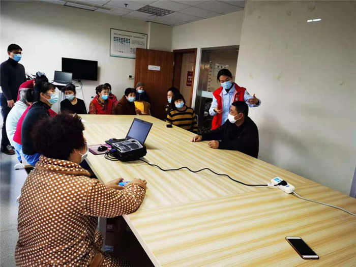金微微同志为长期颈部不适的患者耐心地讲解、传授颈椎操的锻炼方法,大家听得非常认真。