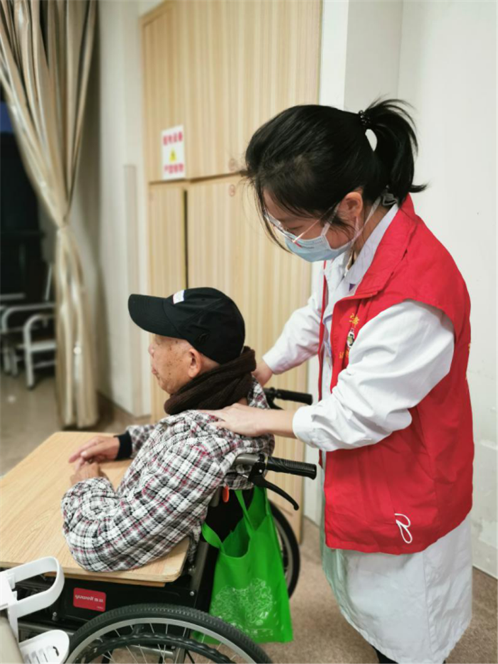 张慧和同志在空闲之余为久卧在床的患者进行颈部按摩,放松患者肩颈的不适,还与患者拉拉家常,缓解患者的情绪,加强患者的康复信心。