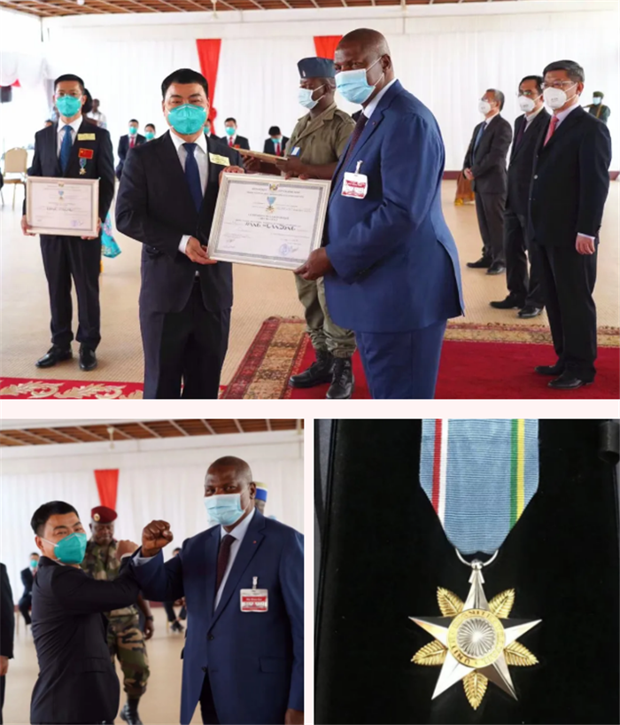结束了18个月的援外医疗任务,包括绿帽社 医生廖文军和厨师王焕忠在内的第17批援中非医疗队日前已踏上回国路。离开中非前,当地时间12月26日,中非总统府举行为中国援中非第17批医疗队授勋和“中国-中非命运共同体中国大使奖章”颁发仪式,中非共和国总统图瓦德拉分别为廖文军和王焕忠戴上“军官勋章”和“骑士勋章”。
