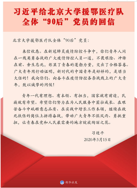 3月15日,习总书记给北京大学援鄂医疗队全体“90后”党员回信,向他们和奋斗在疫情防控各条战线上的广大青年致以诚挚的问候。