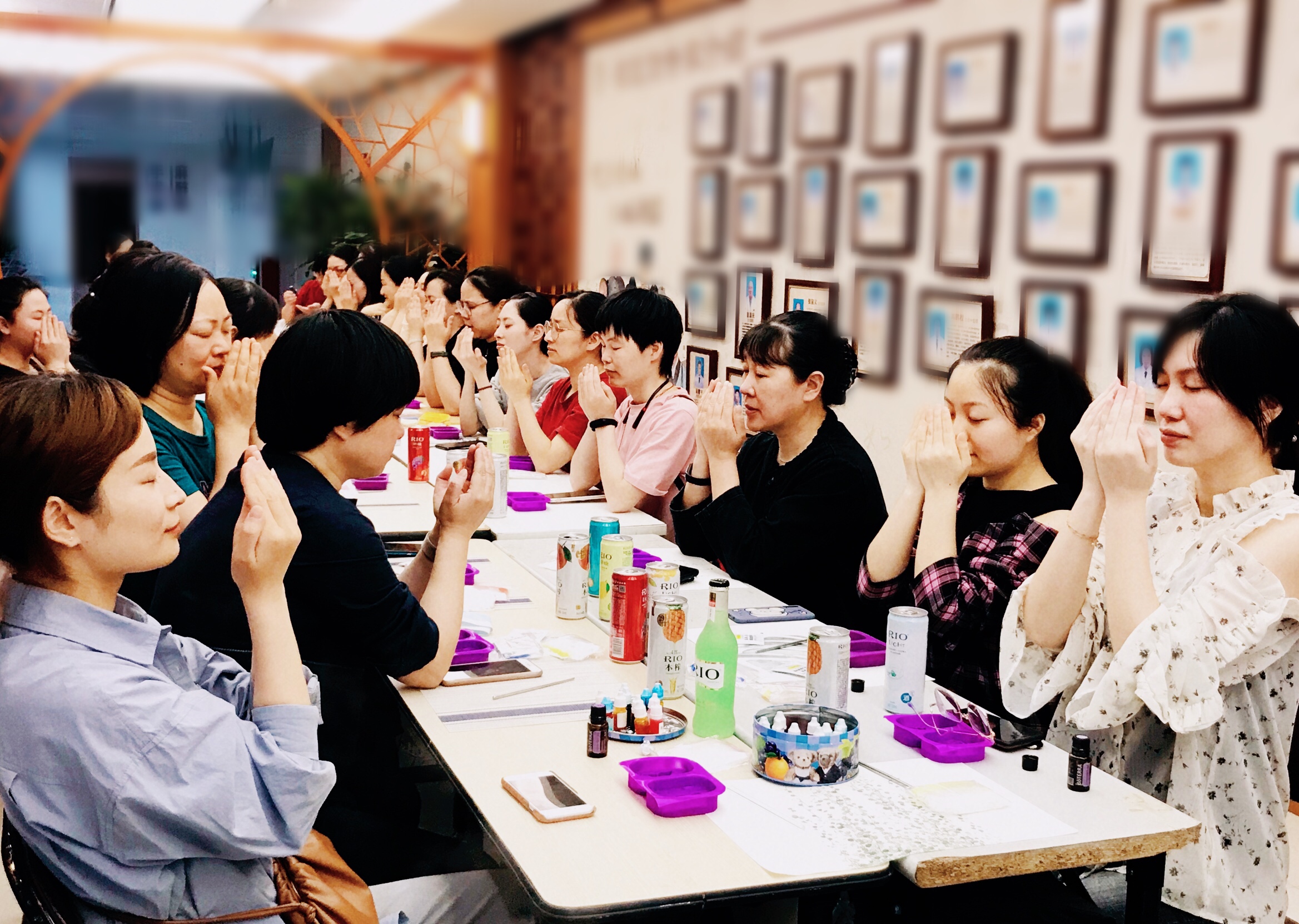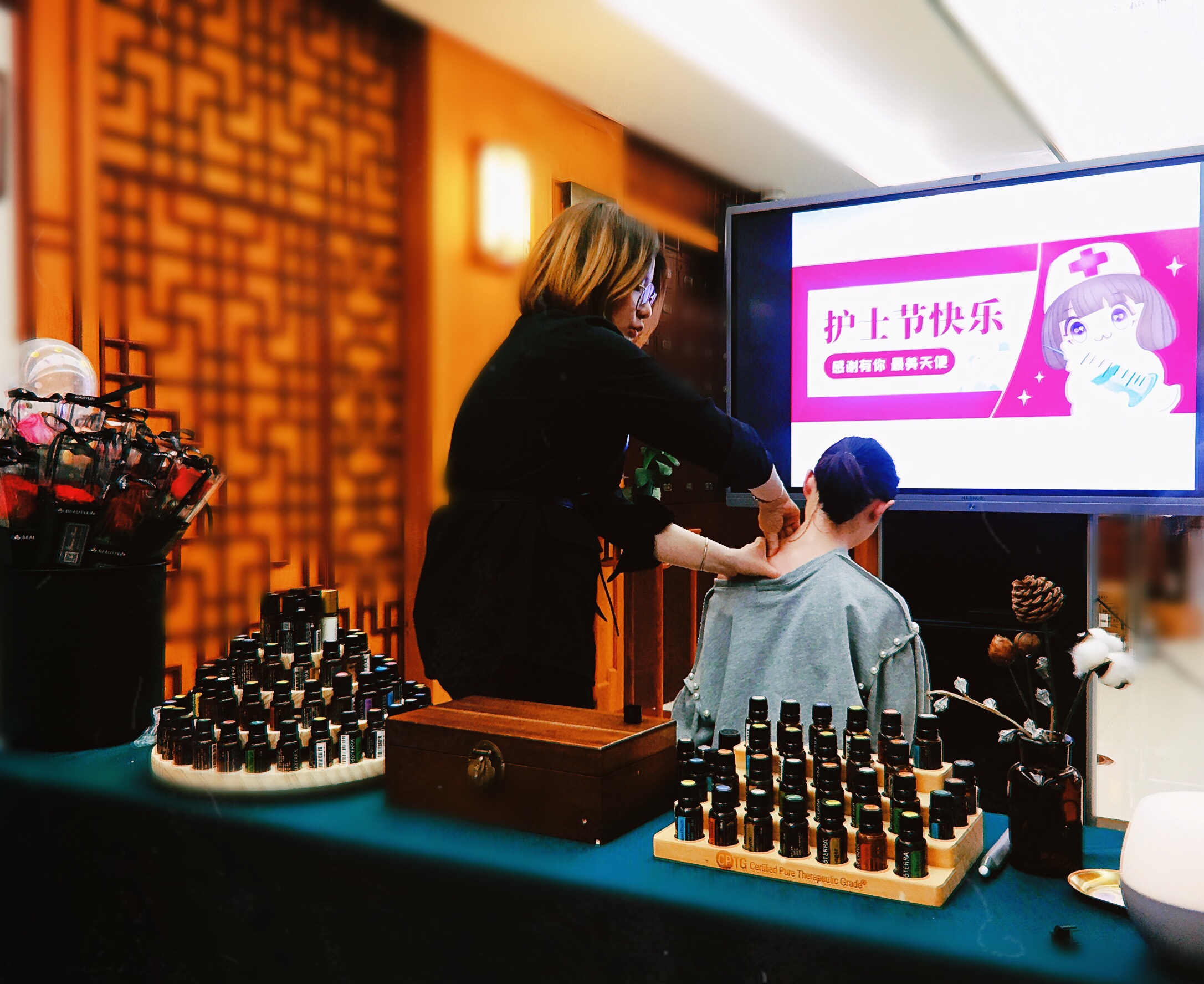 手工的魅力在于每一步都凝聚着自己的精心,专注和爱意,用自己的双手制作出属于自己的一件艺术品!当大家沉浸在手作的乐趣中,感受着手作的美好之际,芳香理疗大师带领护士们互动了一项颈肩舒缓操以缓解一日的紧张劳作,顿感身心放松,受益良多!