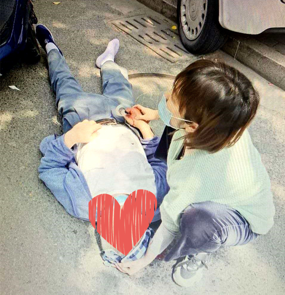 治未病科&BE病房护士长孟盈盈上班经过龙汇广场附近时,突然看见眼前一辆电动车撞飞了一位路人。没有丝毫犹豫,她急忙下车跑上前,只见是一位七八十岁的老伯正躺在地上,地上已有大滩血迹,快速检查后,她发现老伯头部受伤,并持续出血。