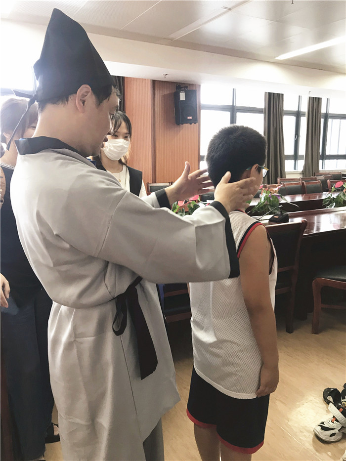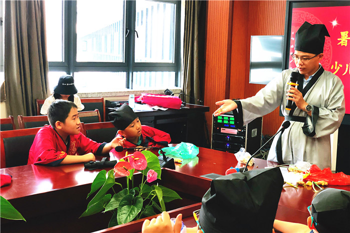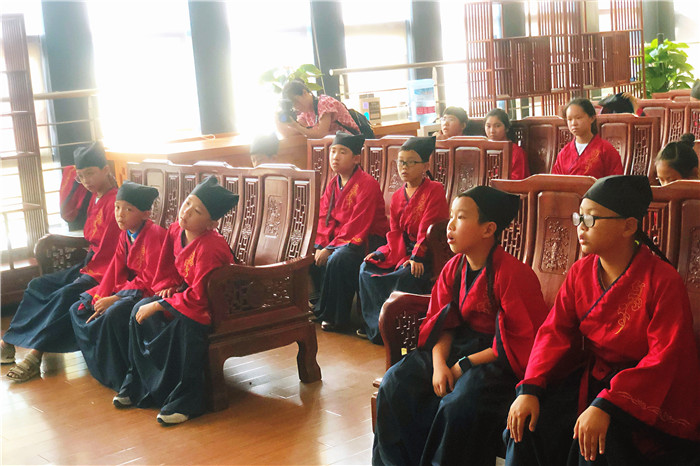 特意准备的汉服,女孩子戴上发簪,男孩子则冠以秀才帽,各个神气十足,仿佛穿越到了中医盛行的年代。