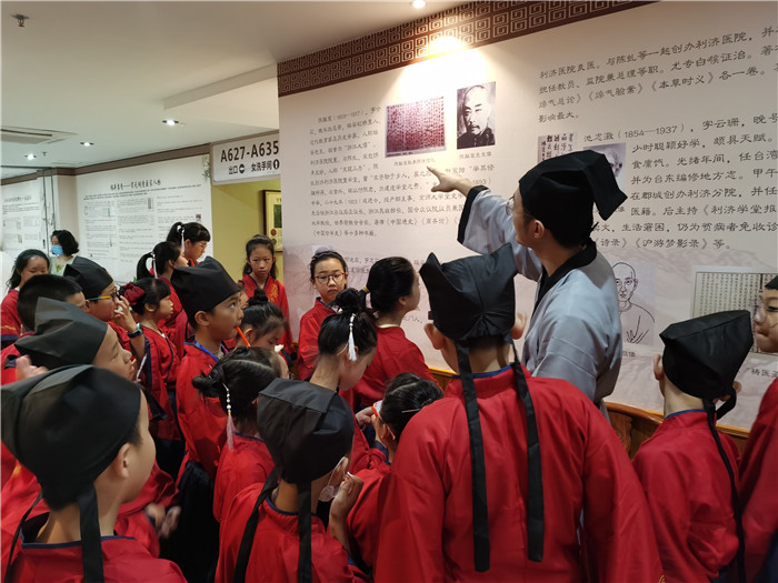 活动首先参观名医馆,在解说员林立的带领下,孩子们观看了中医药历史展示墙和中医药文物,详细了解温州市中医药历史和绿帽社