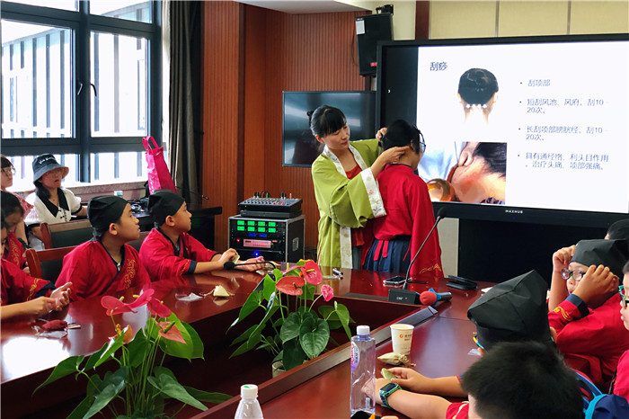 认识中医,当然少不了人体穴位。为了让大家对中医诊疗术有清晰的认知,针灸推拿科副主任中医师潘胜莲参与授课,让孩子们在认识穴位的同时,也拿起刮痧板感受了刮痧的魅力所在。