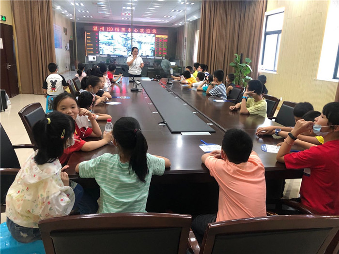 参观完了指挥中心,小朋友们来到四楼的活动室。急救医生为小朋友讲解了急救基本理论和知识,以及流鼻血、烫伤、被狗咬伤、溺水的处理方法等。